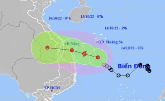 19h/14/10/2022 | Tây Tây Bắc, 15 km/h, có khả năng mạnh lên thành bão | 14,9N-110,3E, cách Đà Nẵng-Quảng Nam khoảng 180km về phía Đông Đông Nam | 8, giật 10 | 12,5-16,0N; phía Tây kinh tuyến 114,0E | Cấp 3:Phía Tây Bắc của khu vực Giữa Biển Đông và phía Tây Nam khu vực Bắc Biển Đông; vùng biển từ Quảng Trị đến Phú Yên |