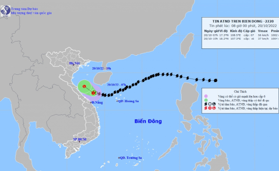 | 19h/20/10 | Tây Tây Bắc, 10 km/h | Suy yếu thành vùng áp thấp trên vùng biển Hà Tĩnh-Quảng Trị | < cấp 6 (Suy yếu thành vùng áp thấp) | 16,0-19,0N; phía Tây kinh tuyến 110,0E | Cấp 3:khu vực Nam vịnh Bắc Bộ, vùng biển từ Quảng Trị đến Quảng Ngãi |