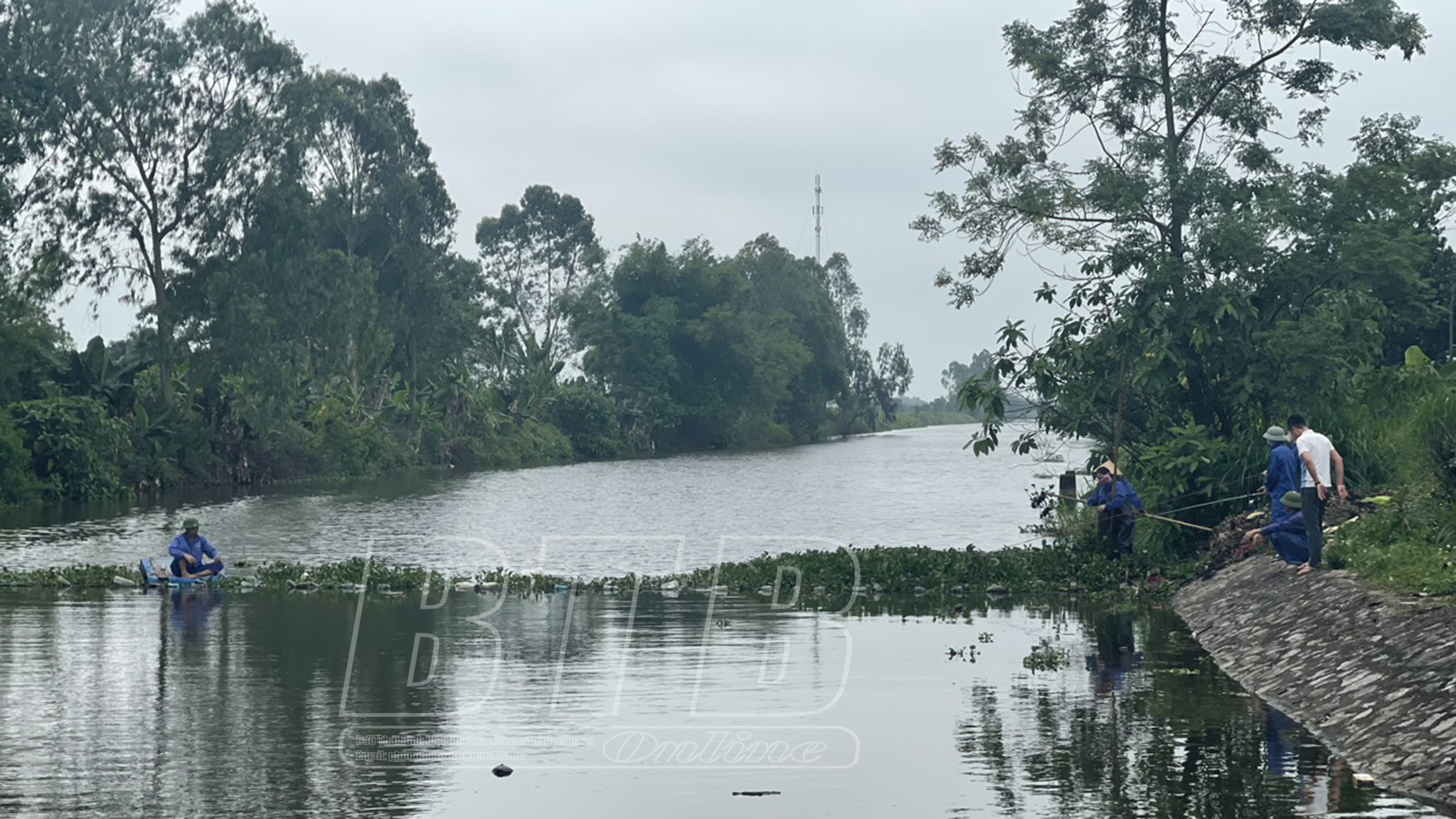 Xí nghiệp Khai thác công trình thủy lợi huyện Hưng Hà tổ chức vớt bèo bồng, khơi thông dòng chảy.