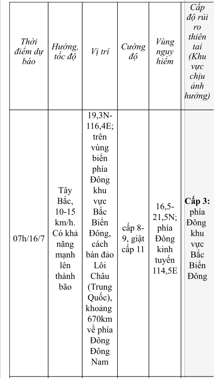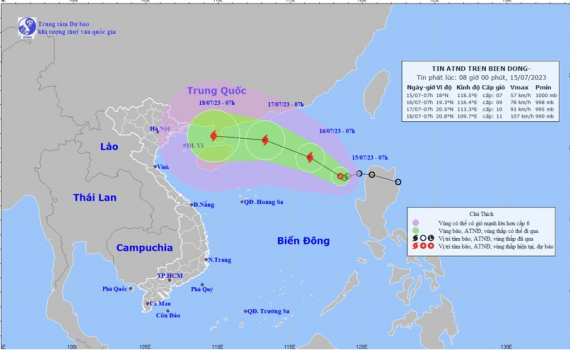 Hồi 07 giờ (15/7), vị trí tâm áp thấp nhiệt đới ở vào khoảng 18,0 độ Vĩ Bắc; 118,5 độ Kinh Đông, trên vùng biển phía Đông khu vực Bắc Biển Đông. Sức gió mạnh nhất vùng gần tâm áp thấp nhiệt đới mạnh cấp 7 (50-61km/giờ), giật cấp 9.