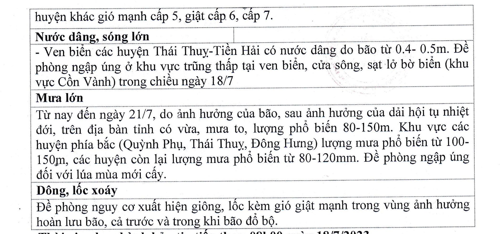- Công điện khẩn số 03/CĐ-PCTT, hồi 7 giờ 00' ngày 20/7/2024 của Ban Chỉ huy Phòng, chống thiên tai và Tìm kiếm cứu nạn tỉnh Thái Bình 21.07.2024 | 07:47 AM