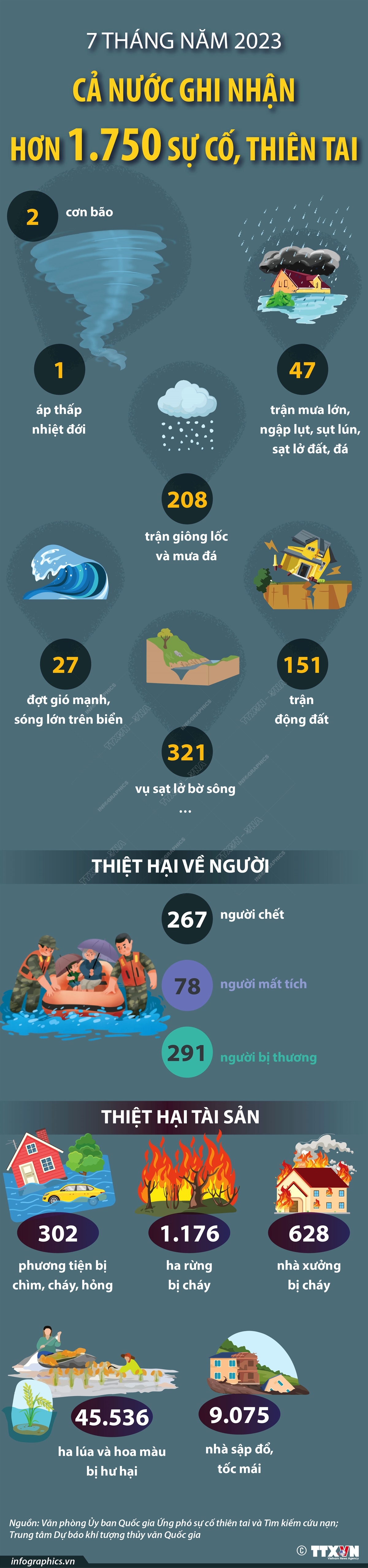 Trong 7 tháng năm 2023, cả nước ghi nhận 1.753 sự cố, thiên tai, làm chết 267 người, mất tích 78 người, bị thương 291 người.