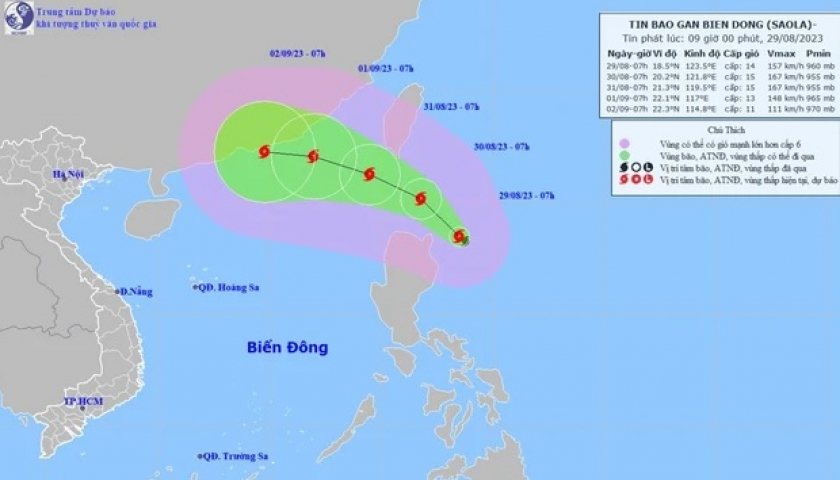 Theo Trung tâm dự báo khí tượng thủy văn quốc gia, Biển Đông sẽ đón bão Saola, bão số 3 trong năm 2023 khoảng 48 giờ nữa. Cùng lúc đó, bão Haikui cũng mới hình thành, cách bão Saola khoảng 1.500km về phía Đông.