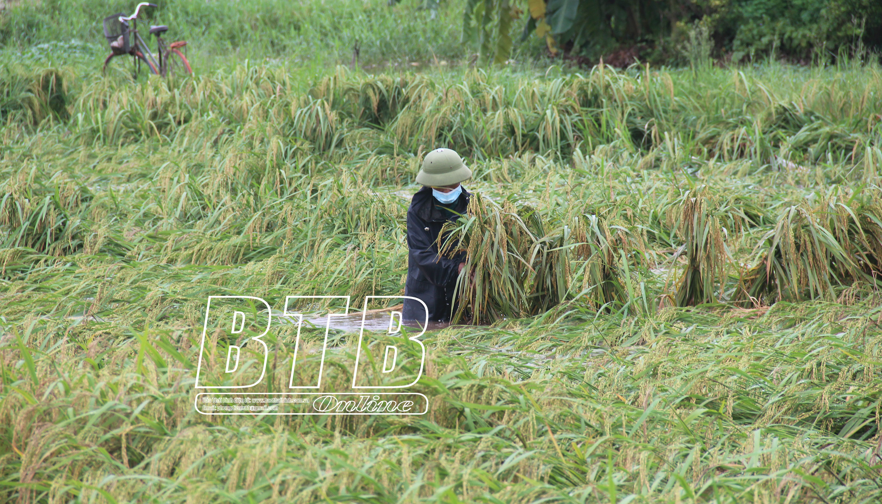 Nông dân huyện Kiến Xương buộc dựng lúa bị đổ ngập do mưa lớn.