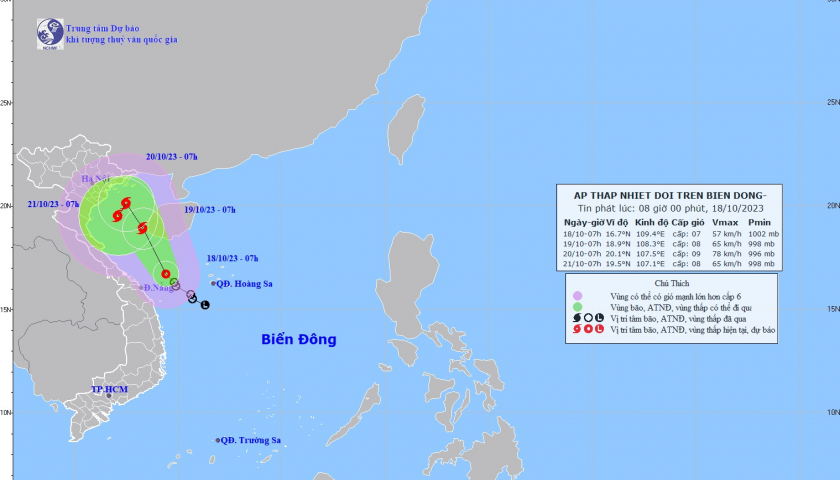 Hồi 07 giờ ngày 18/10, vị trí tâm áp thấp nhiệt đới ở vào khoảng 16,7 độ Vĩ Bắc; 109,4 độ Kinh Đông, cách quần đảo Hoàng Sa khoảng 240km về phía Tây Tây Bắc, cách đất liền khu vực Quảng Trị-Quảng Ngãi khoảng 170km về phía Đông. Sức gió mạnh nhất vùng gần tâm áp thấp nhiệt đới mạnh cấp 7 (50-61km/giờ), giật cấp 9. Di chuyển theo hướng Tây Bắc với tốc độ khoảng 5-10km/h.