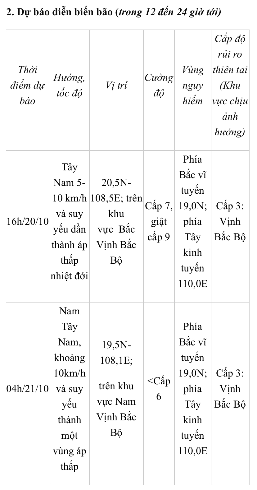 Hồi 04 giờ ngày 20/10, vị trí tâm bão ở vào khoảng 21,2 độ Vĩ Bắc; 109,3 độ Kinh Đông, trên vùng biển phía Đông Bắc khu vực Bắc Vịnh Bắc Bộ. Sức gió mạnh nhất vùng gần tâm bão mạnh cấp 8-9 (62-88km/giờ), giật cấp 11. Di chuyển theo hướng Bắc Đông Bắc với tốc độ khoảng 10km/h.