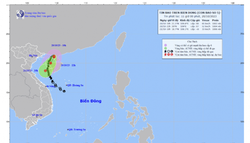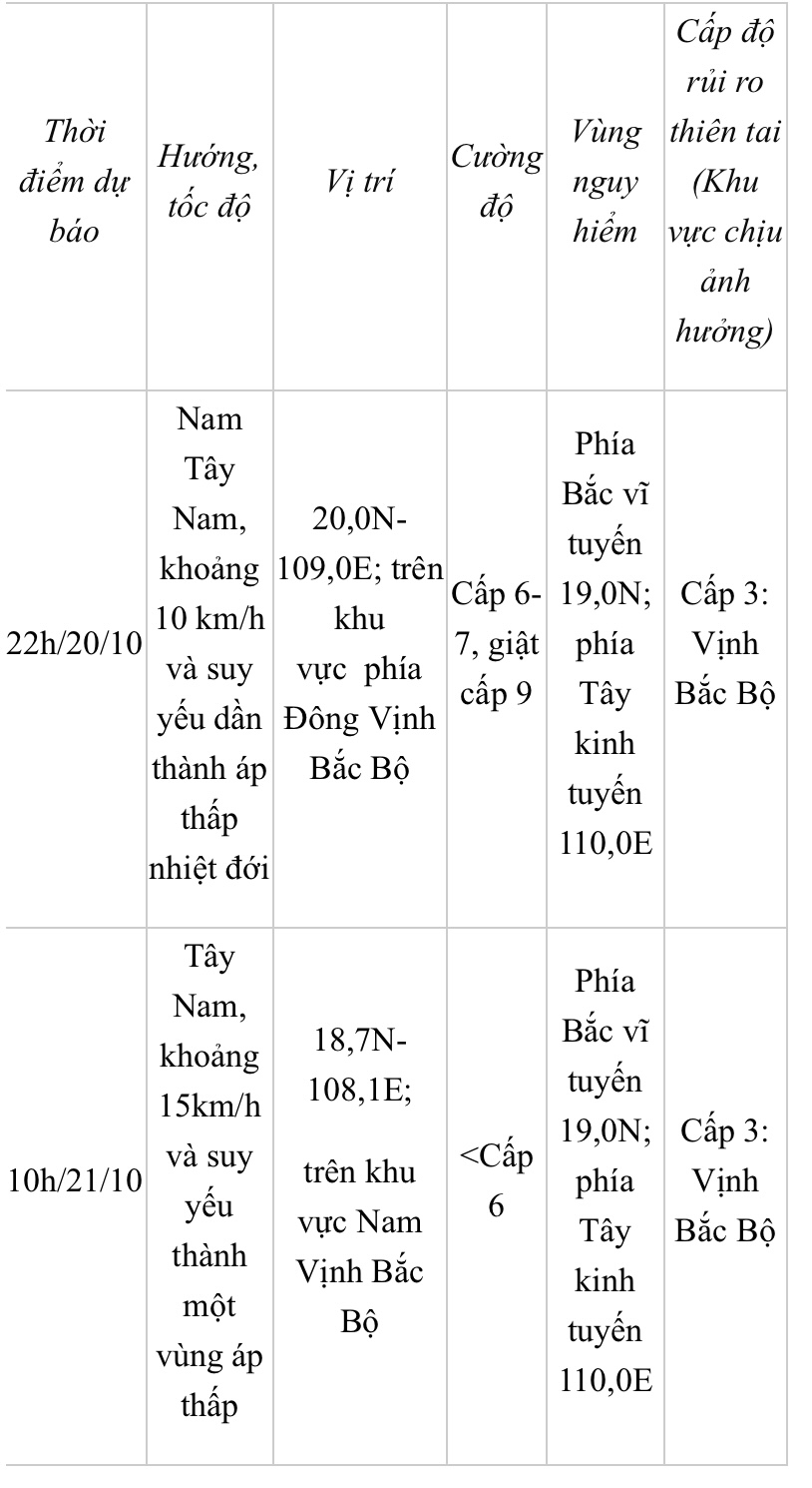 Hồi 10 giờ ngày 20/10, vị trí tâm bão ở vào khoảng 21,1 độ Vĩ Bắc; 109,6 độ Kinh Đông, trên vùng biển phía Đông Bắc khu vực Bắc Vịnh Bắc Bộ. Sức gió mạnh nhất vùng gần tâm bão mạnh cấp 8 (62-74km/giờ), giật cấp 10. Di chuyển theo hướng Nam Tây Nam với tốc độ khoảng 10km/h.