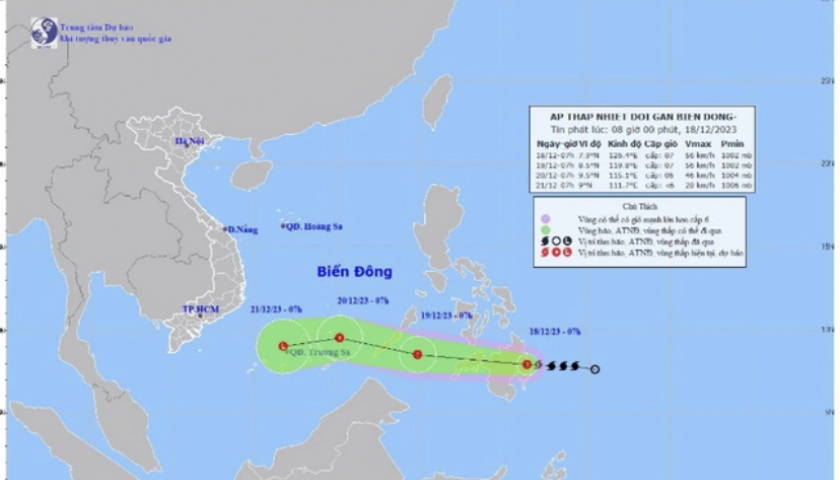 Trên biển: Vùng biển phía Đông Nam khu vực Giữa Biển Đông và phía Đông Bắc khu vực Nam Biển Đông từ đêm 18/12 có gió mạnh dần lên cấp 6, giật cấp 8; biển động. Sóng biển cao 2,0-4,0m.