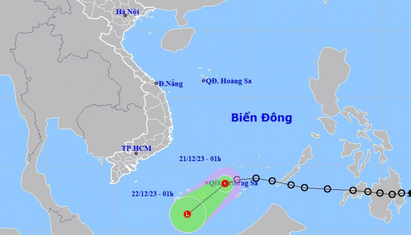 Dự báo đến 1h ngày 22/12, áp thấp nhiệt đới nằm tại vị trí 6,3N-110,5E, trên vùng biển phía Tây Nam khu vực quần đảo Trường Sa với cường độ cấp 6.