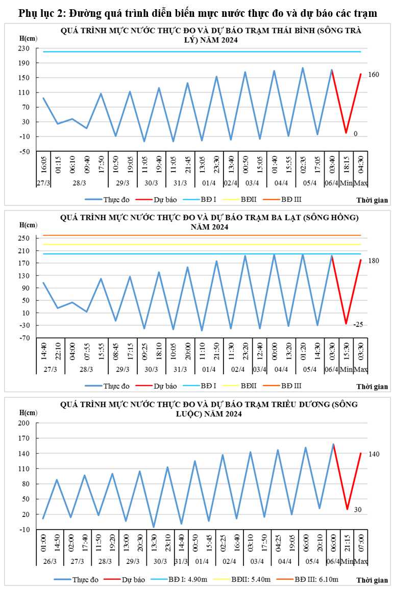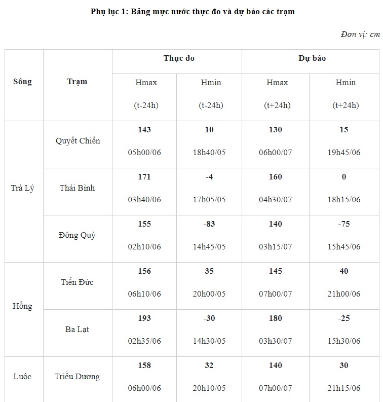 - Mực nước trên các sông Trà Lý, sông Hồng, sông Luộc tiếp tục và chịu ảnh hưởng của thủy triều, điều tiết hồ thủy điện: xu thế xuống.
