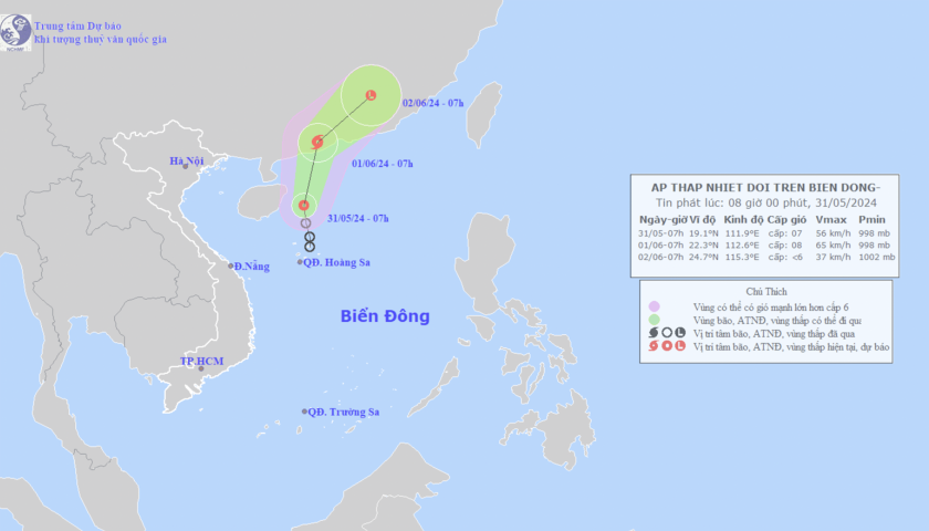 Theo tin từ Trung tâm Dự báo Khí tượng thủy văn quốc gia, hồi 7 giờ ngày 31/5, vị trí tâm áp thấp nhiệt đới ở vào khoảng 19,1 độ Vĩ Bắc; 111,9 độ Kinh Đông, trên khu vực phía Bắc quần đảo Hoàng Sa, cách đảo Hải Nam (Trung Quốc) khoảng 160km về phía Đông. Sức gió mạnh nhất vùng gần tâm áp thấp nhiệt đới mạnh cấp 7 (50-61km/h), giật cấp 9; di chuyển theo hướng Bắc với tốc độ khoảng 10km/h.