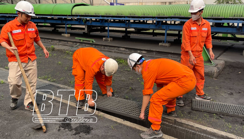 Lực lượng xung kích Công ty Nhiệt điện Thái Bình khơi thông hệ thống rãnh thoát nước xung quanh nhà máy để phòng, chống ngập úng.