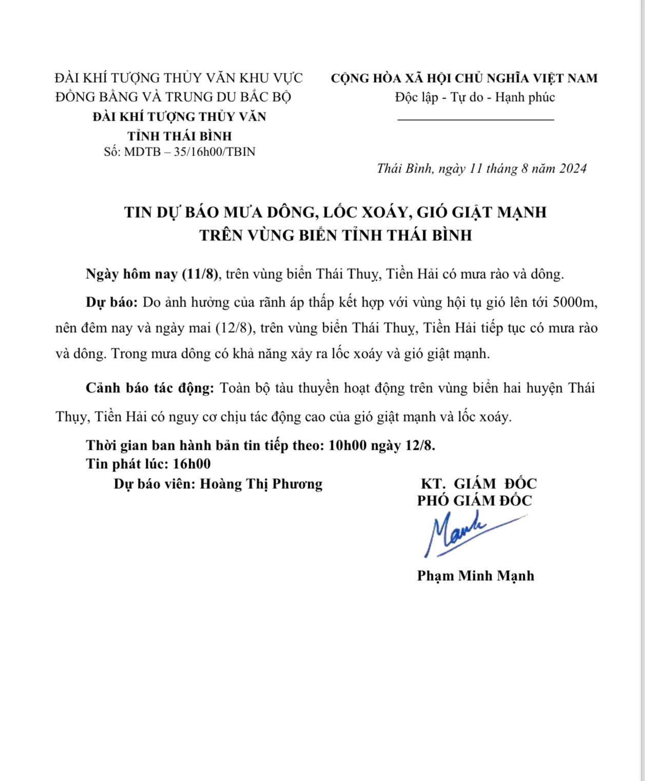 - Công điện khẩn số 11/CĐ-PCTT ngày 5/9/2024 của Ban Chỉ huy PCTT và TKCN tỉnh Thái Bình điện Ban Chỉ huy PCTT và TKCN các cấp, các ngành 05.09.2024 | 19:05 PM