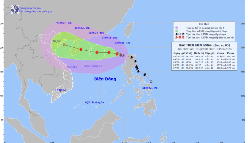 Hồi 19 giờ ngày 03/9, vị trí tâm bão ở vào khoảng 18,7 độ Vĩ Bắc; 118,5 độ Kinh Đông, trên vùng biển phía Đông khu vực Bắc Biển Đông. Sức gió mạnh nhất vùng gần tâm bão mạnh cấp 10 (89-102km/h), giật cấp 12, di chuyển theo hướng Tây Tây Bắc, khoảng 10km/h.
