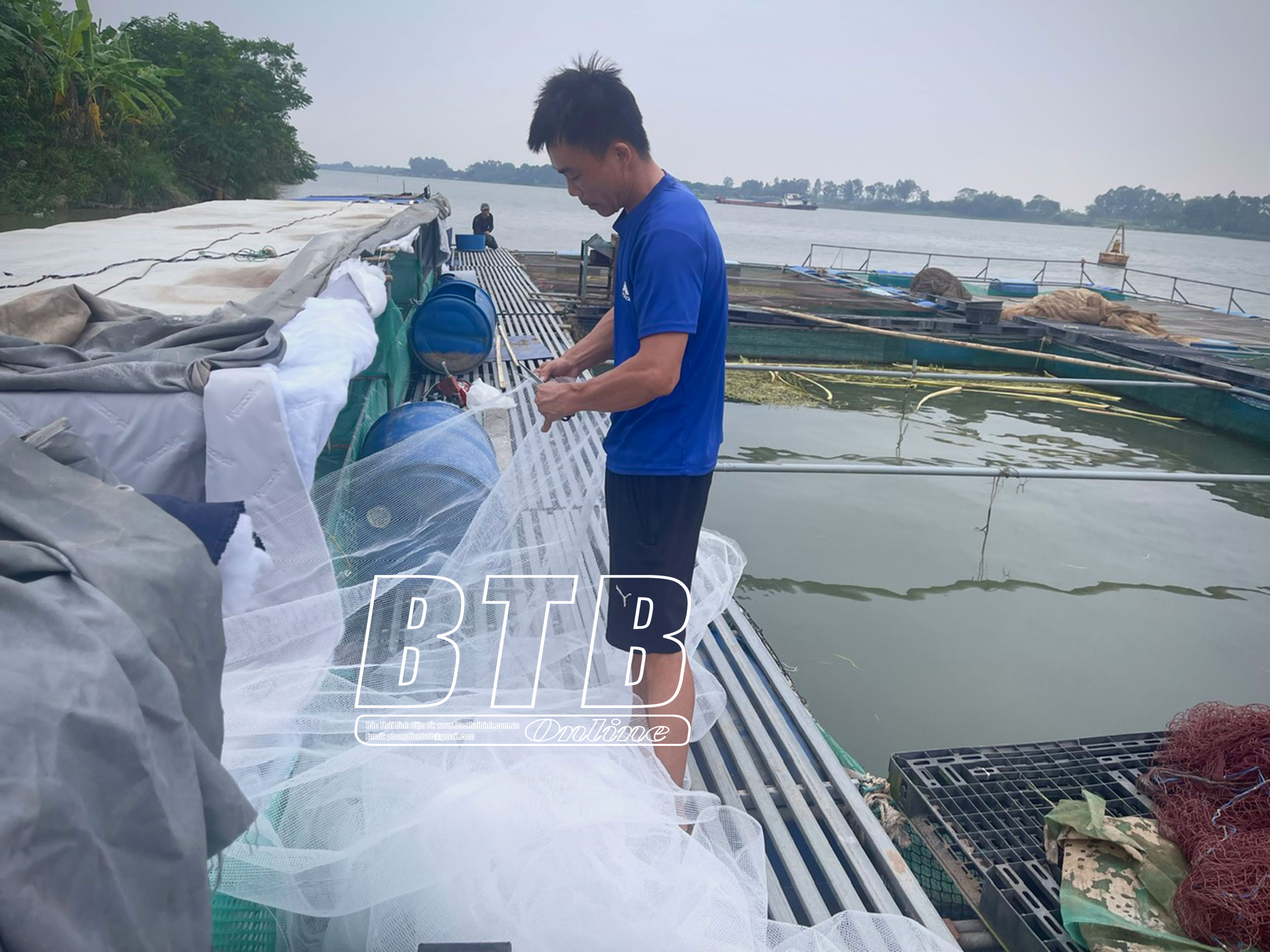 Người nuôi cá lồng huyện Hưng Hà chủ động chằng chống lồng bè.