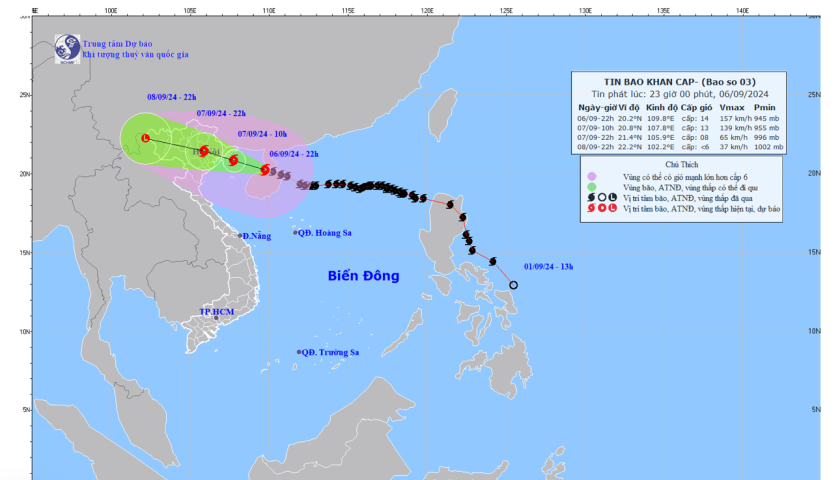 Hồi 22 giờ ngày 06/9, vị trí tâm bão số 3 ở vào khoảng 20,2 độ Vĩ Bắc; 109,8 độ Kinh Đông, trên vùng biển phía Đông vịnh Bắc Bộ; cách Quảng Ninh khoảng 310km về phía Đông Đông Nam. Sức gió mạnh nhất vùng gần tâm bão mạnh cấp 14 (150-166km/h), giật cấp 17, di chuyển theo hướng Tây Tây Bắc, tốc độ 15-20km/h.