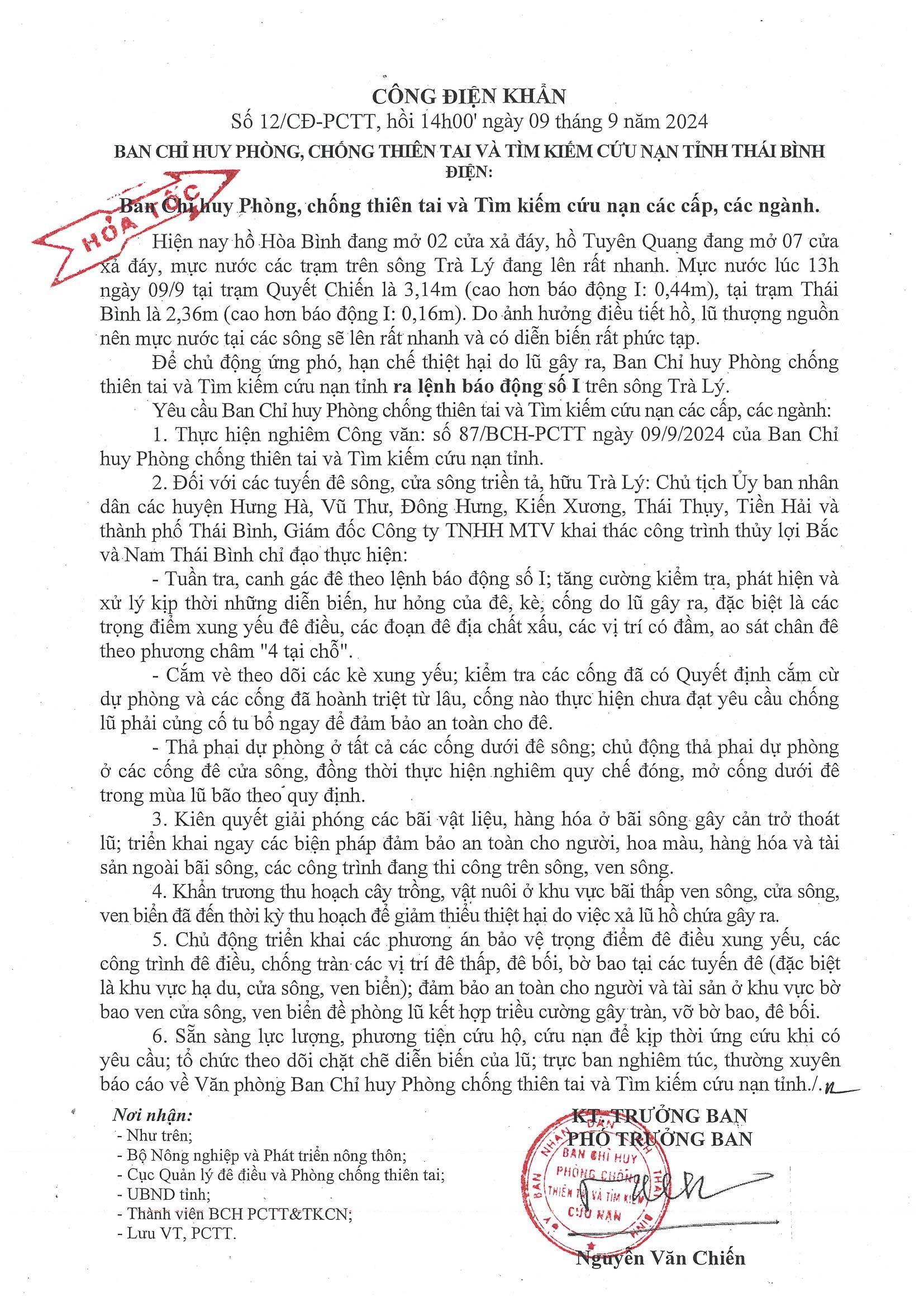 Công điện khẩn số 12/CĐ-PCTT ngày 9/9/2024 của Ban Chỉ huy PCTT và TKCN tỉnh Thái Bình điện Ban Chỉ huy PCTT và TKCN các cấp, các ngành