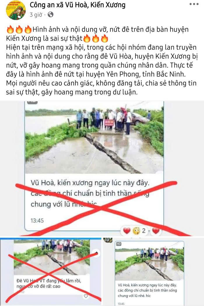 Trang Facebook của Công an xã Vũ Hòa, huyện Kiến Xương bác bỏ thông tin sai sự thật về việc xảy ra vỡ đê trên địa bàn xã. Ảnh chụp màn hình: Công an cung cấp.
