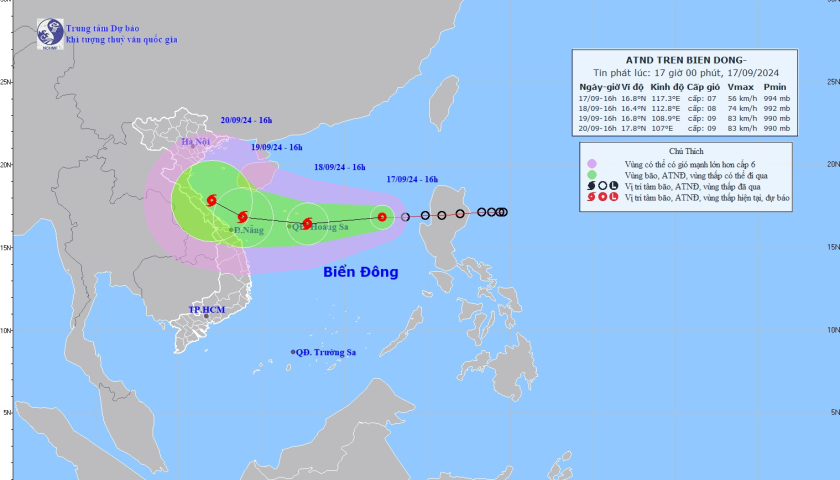 Hồi 16 giờ ngày 17/9, vị trí tâm áp thấp nhiệt đới ở vào khoảng 16,8 độ Vĩ Bắc; 117,3 độ Kinh Đông, trên vùng biển phía Đông khu vực Bắc Biển Đông, cách quần đảo Hoàng Sa khoảng 620km về phía Đông. Sức gió mạnh nhất vùng gần tâm áp thấp nhiệt đới mạnh cấp 7 (50-61km/h),giật cấp 9;di chuyển chủ yếu theo hướng Tây với tốc độ khoảng 25-30km/h.