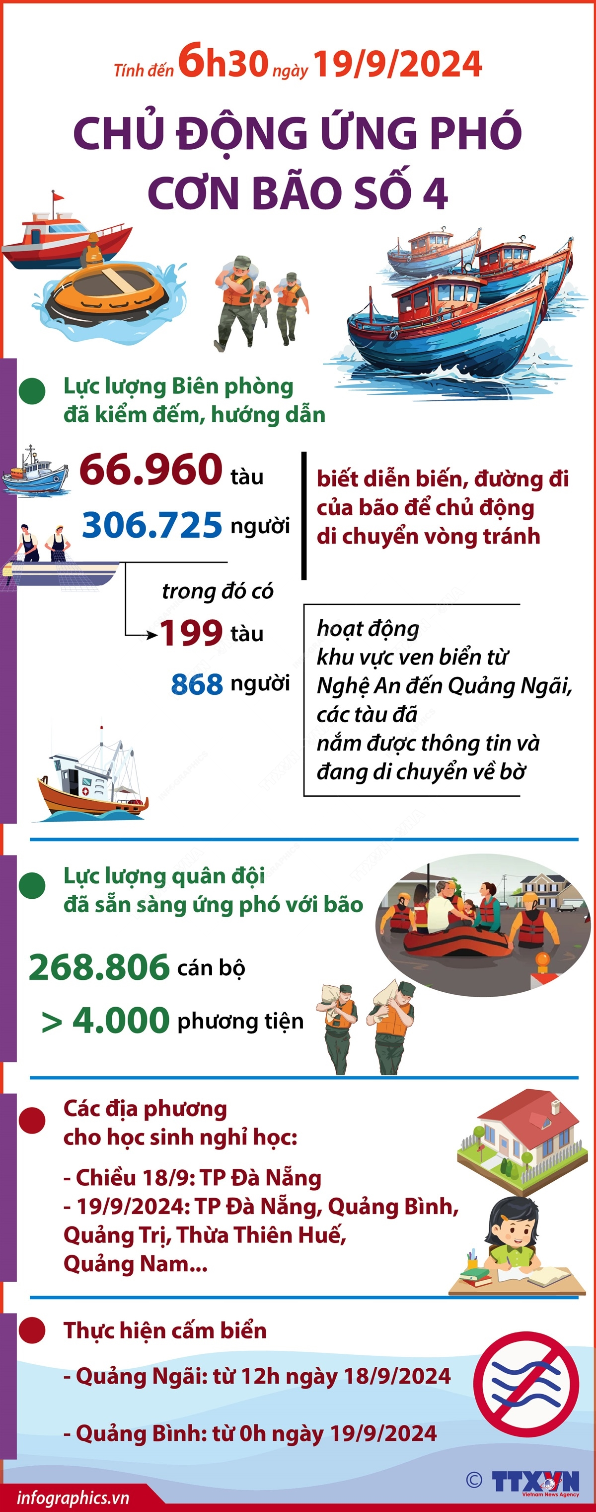 Theo Báo cáo nhanh công tác trực ban phòng chống thiên tai của Bộ Nông nghiệp và Phát triển nông thôn, tính đến 6h30 ngày 19/9, lực lượng Biên phòng đã kiểm đếm, hướng dẫn được 66.960 tàu/306.725 người biết diễn biến, hướng di chuyển của bão số 4 để chủ động di chuyển vòng tránh, trong đó, 199 tàu/868 người hoạt động khu vực ven biển từ Nghệ An đến Quảng Ngãi, các tàu đã nắm được thông tin và đang di chuyển về bờ. TP Đà Nẵng và tỉnh Quảng Nam cho học sinh nghỉ học ngày 19/9/2024; 2 tỉnh thực hiện cấm biển là Quảng Ngãi từ 12h ngày 18/9/2024 và Quảng Bình từ 0h ngày 19/9/2024.