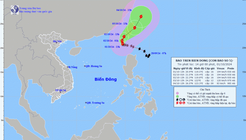 Hồi 13 giờ ngày 01/10, vị trí tâm bão ở vào khoảng 20,9 độ Vĩ Bắc; 119,5 độ Kinh Đông, trên vùng biển phía Đông Bắc của khu vực Bắc Biển Đông. Sức gió mạnh nhất vùng gần tâm bão mạnh cấp 16 (184-201km/h), giật trên cấp 17; di chuyển theo hướng Tây Tây Bắc, tốc độ khoảng 5km/h.