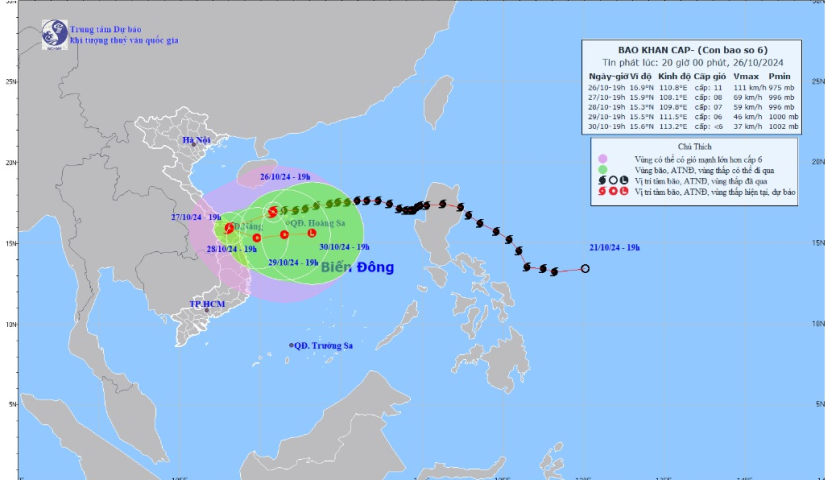 Hồi 19 giờ ngày 26/10, vị trí tâm bão ở vào khoảng 16,9 độ Vĩ Bắc; 110,8 độ Kinh Đông, trên vùng biển phía Tây Bắc quần đảo Hoàng Sa, cách Đà Nẵng khoảng 290km về phía Đông Đông Bắc. Sức gió mạnh nhất vùng gần tâm bão mạnh cấp 11 (103-117km/h), giật cấp 14. Di chuyển theo hướng Tây, tốc độ khoảng 20km/h.
