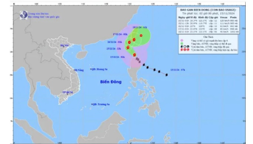 Theo Trung tâm Dự báo Khí tượng Thủy văn Quốc gia, lúc 1 giờ ngày 15/11, vị trí tâm bão Usagi ở vào khoảng 19,3 độ Vĩ Bắc; 121,1 độ Kinh Đông, trên vùng biển phía Bắc đảo đảo Luzon (Philippines).