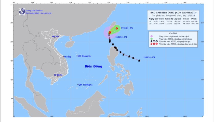 Hồi 07 giờ ngày 16/11, vị trí tâm bão ở vào khoảng 22,4 độ Vĩ Bắc; 120,3 độ Kinh Đông, trên vùng biển phía Nam Đài Loan (Trung Quốc). Sức gió mạnh nhất vùng gần tâm bão mạnh cấp 8 (62-74km/h), giật cấp 10. Di chuyển theo hướng Bắc Đông Bắc, tốc độ khoảng 15km/h.