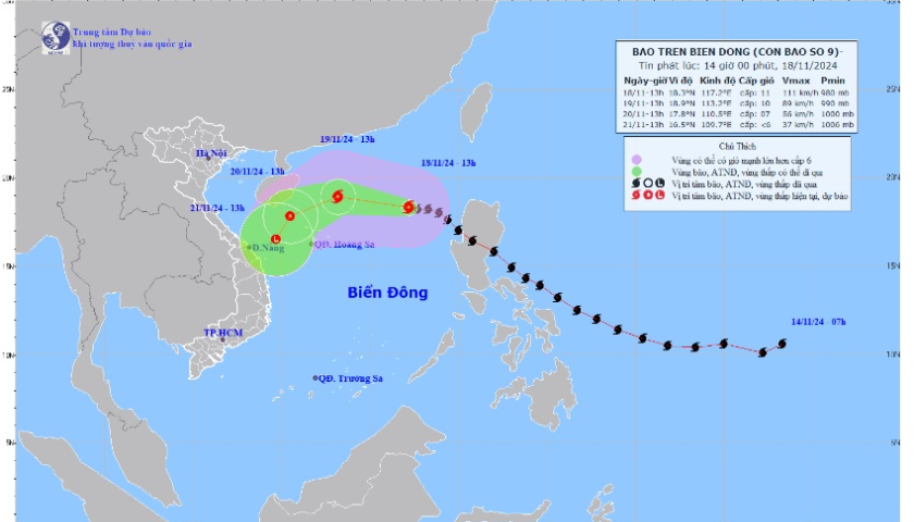 Hồi 13 giờ ngày 18/11, vị trí tâm bão ở vào khoảng 18,3 độ Vĩ Bắc; 117,2 độ Kinh Đông,trênvùng biển phía Đông của khu vực Bắc Biển Đông, cách quần đảo Hoàng Sa khoảng 550km về phía Đông Đông Bắc. Sức gió mạnh nhất vùng gần tâm bão mạnh cấp 11 (103-117km/h), giật cấp 14. Di chuyển theo hướng Tây Tây Bắc, tốc độ khoảng 20km/h.
