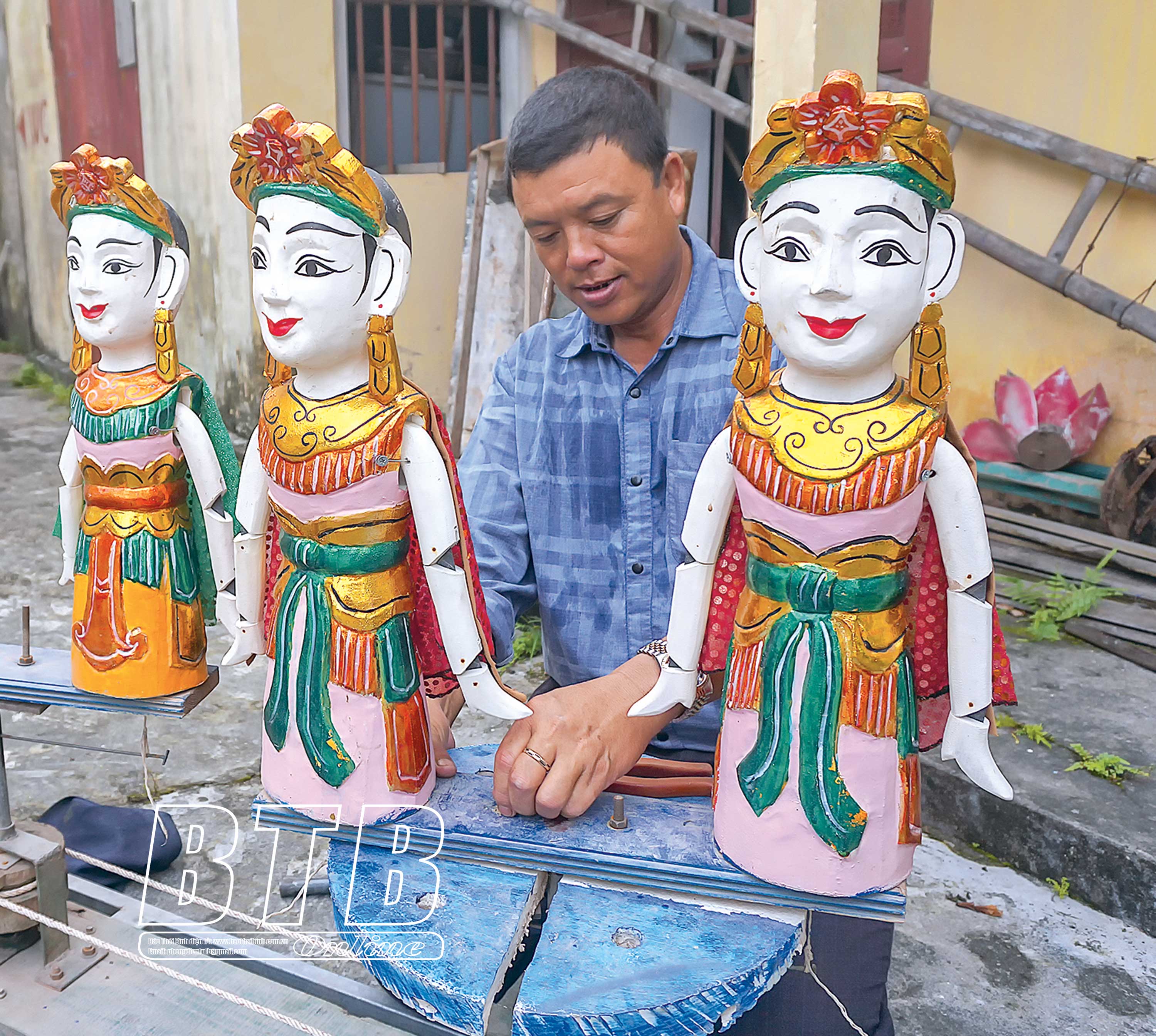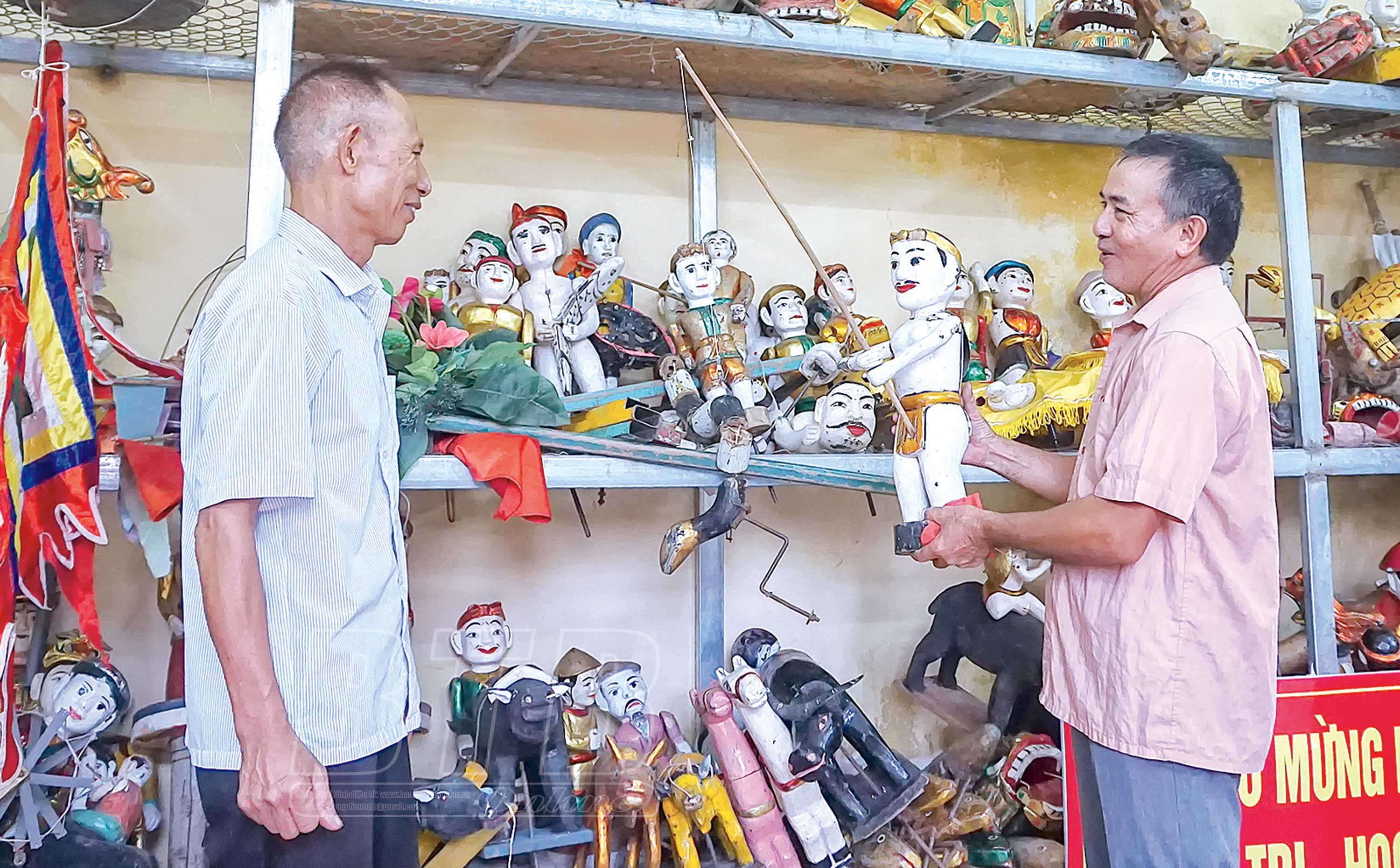 Nghệ nhân phường rối nước Nguyên Xá chuẩn bị cho buổi tập luyện, biểu diễn.