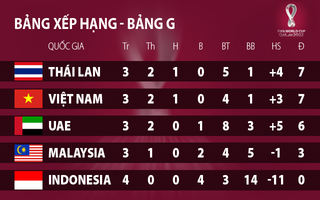 Thêm vào đó, với 7 điểm có được sau 3 lượt trận, Việt Nam cũng đã góp mặt trong top 2 đội đầu bảng G, qua đó nuôi mộng đi tiếp ở vòng loại World Cup 2022.