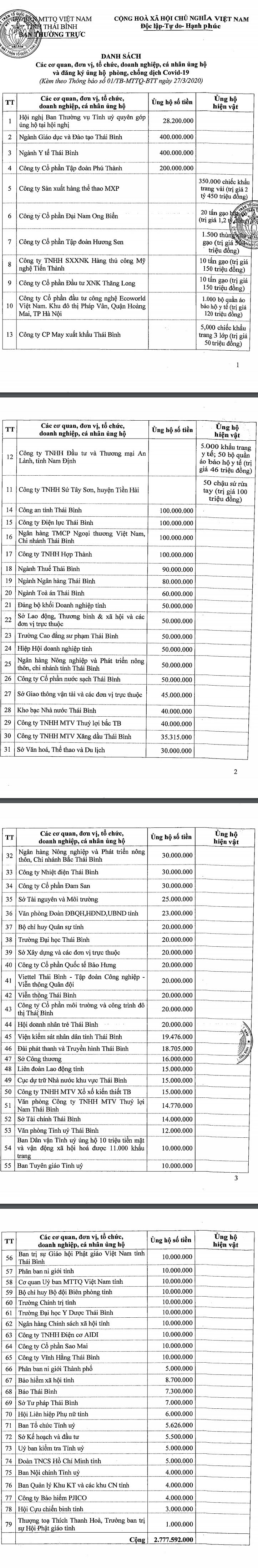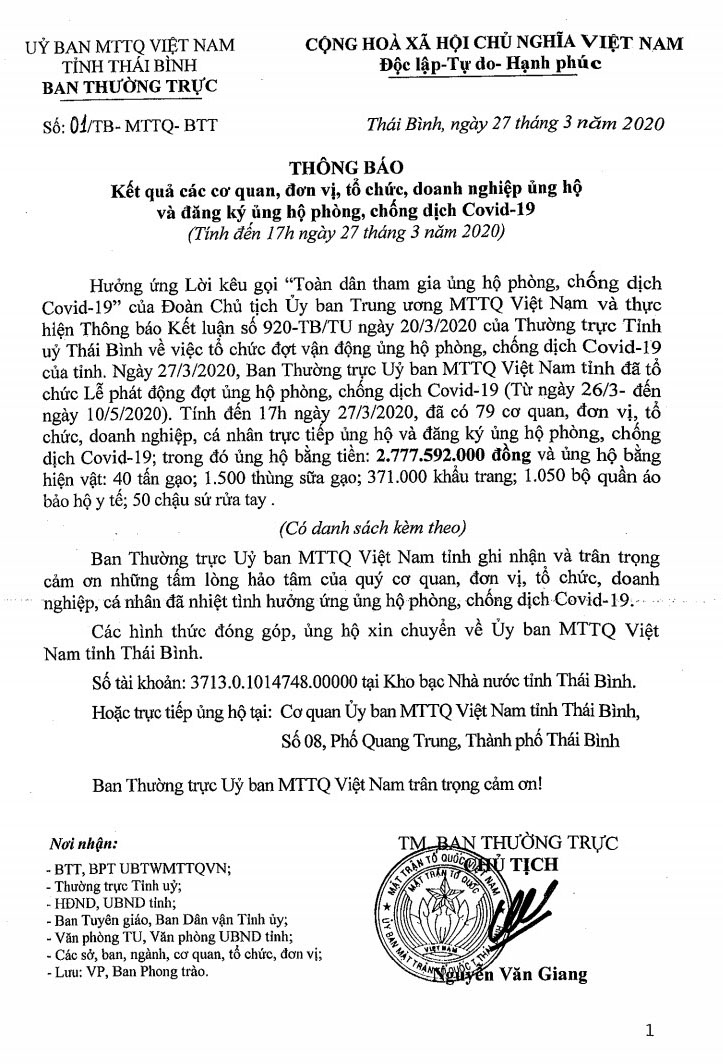 Thông báo kết quả các cơ quan, đơn vị, tổ chức, doanh nghiệp ủng hộ và đăng ký ủng hộ phòng, chống dịch Covid