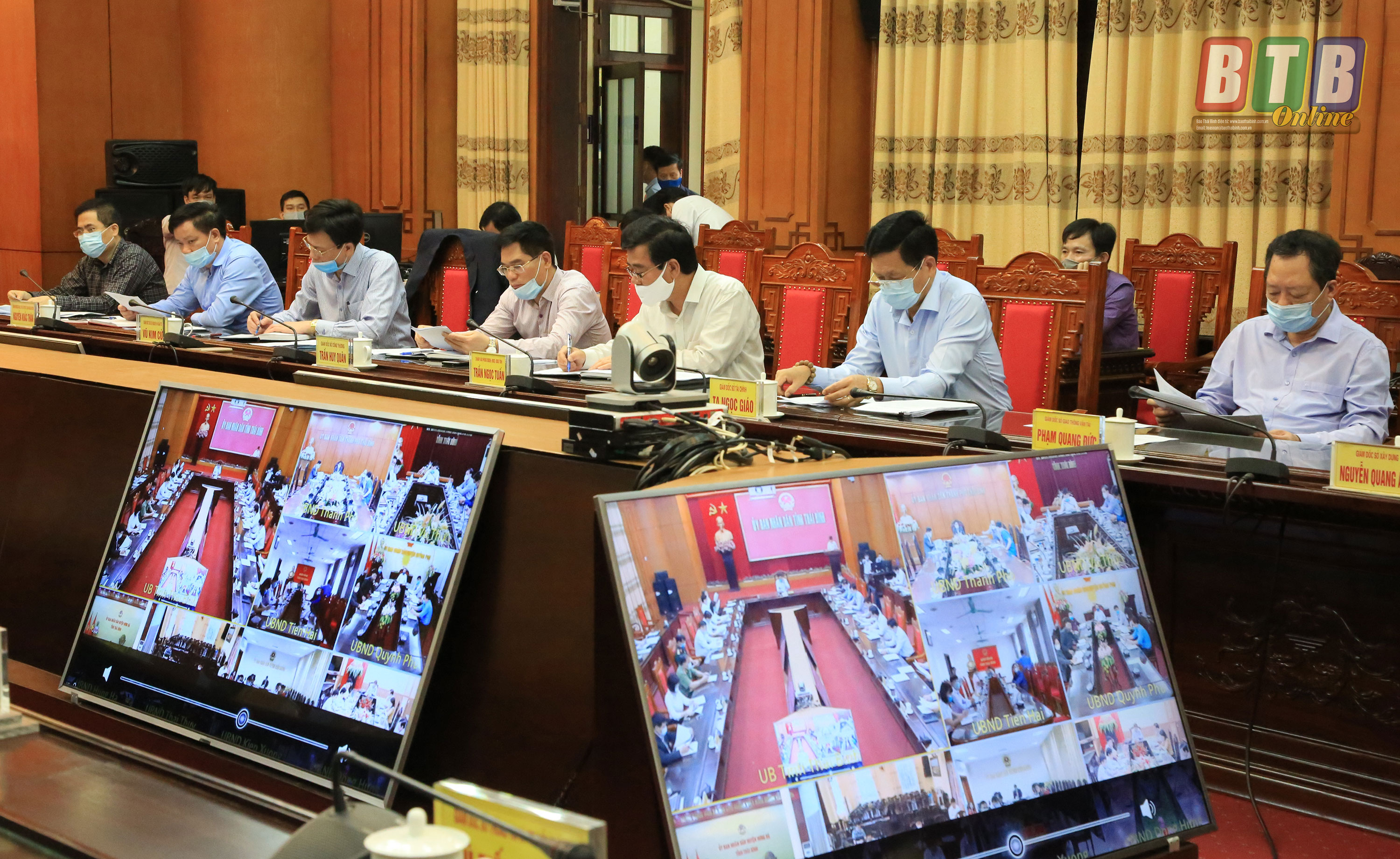 Sáng ngày 23/4, đồng chí Đặng Trọng Thăng, Phó Bí thư Tỉnh ủy, Chủ tịch UBND tỉnh chủ trì cuộc họp trực tuyến của UBND tỉnh với các sở, ngành, các huyện, thành phố nghe và cho ý kiến về đề xuất thực hiện chính sách hỗ trợ đối với cán bộ, công chức cấp xã dôi dư do thực hiện sắp xếp đơn vị hành chính cấp xã giai đoạn 2019 - 2021 và cán bộ xã, phường, thị trấn thôi tái cử cấp ủy, nhiệm kỳ 2020 - 2025; điều chỉnh việc bố trí số lượng cán bộ, công chức xã, phường, thị trấn trên địa bàn tỉnh Thái Bình, một số nội dung sửa đổi, bổ sung Nghị quyết số 25/2018/NQ-HĐND ngày 11/12/2018 của HĐND tỉnh.
