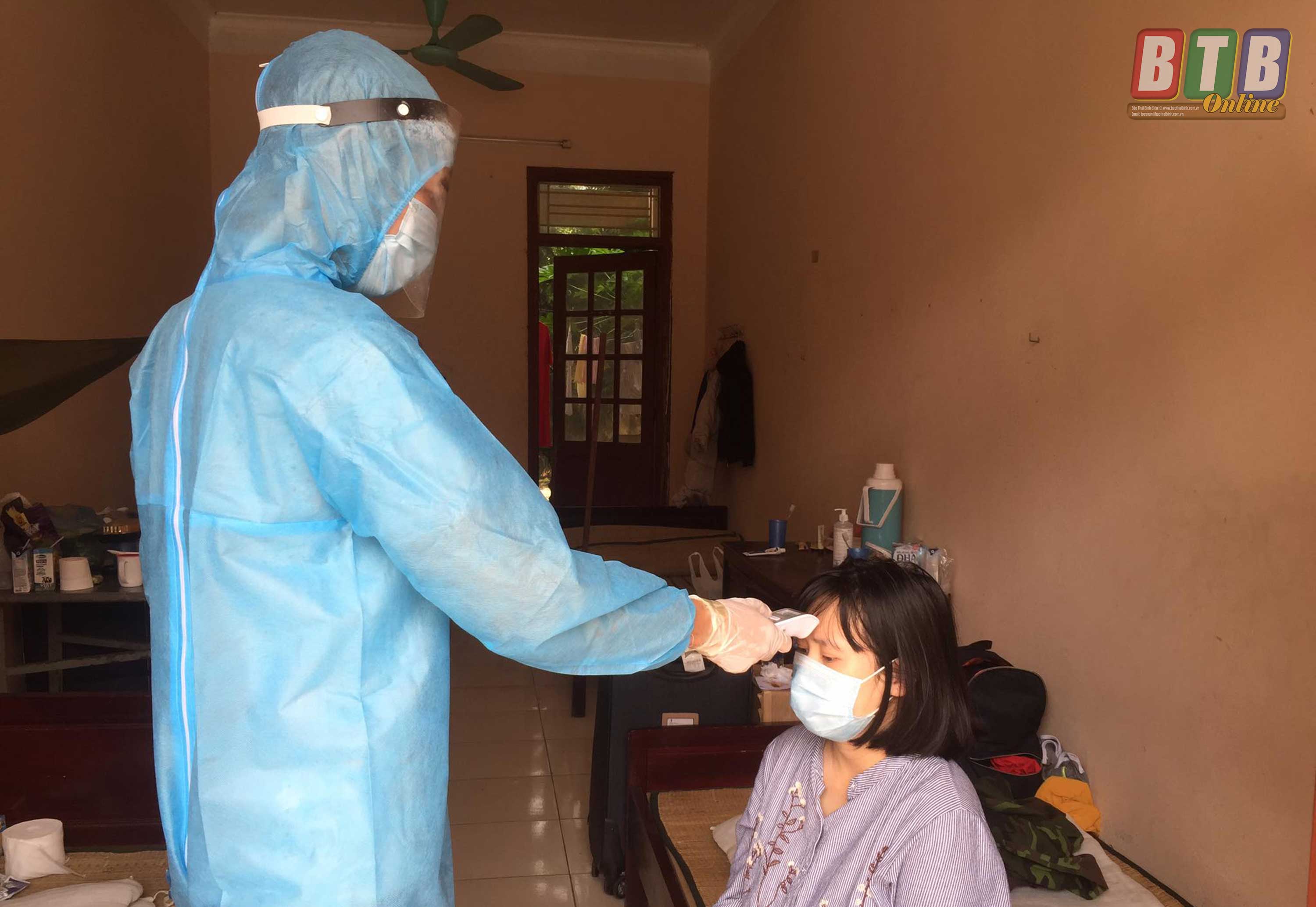 Cán bộ y tế kiểm tra thân nhiệt cho thai phụ ở khu cách ly tập trung tại Trung đoàn 568, Bộ CHQS tỉnh.