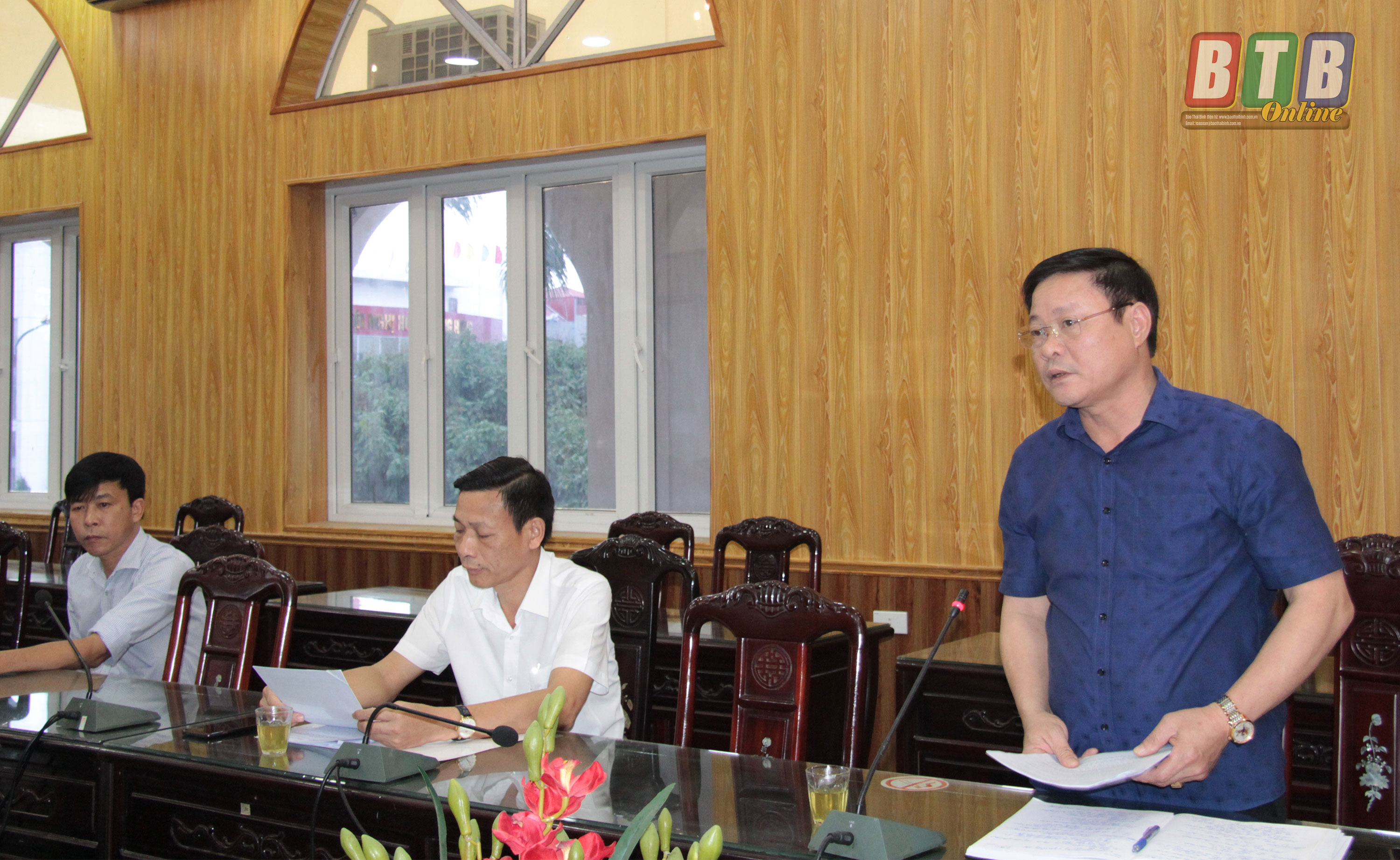 Lãnh đạo huyện Đông Hưng báo cáo công tác hỗ trợ người dân gặp khó khăn do đại dịch Covid -19 trên địa bàn.