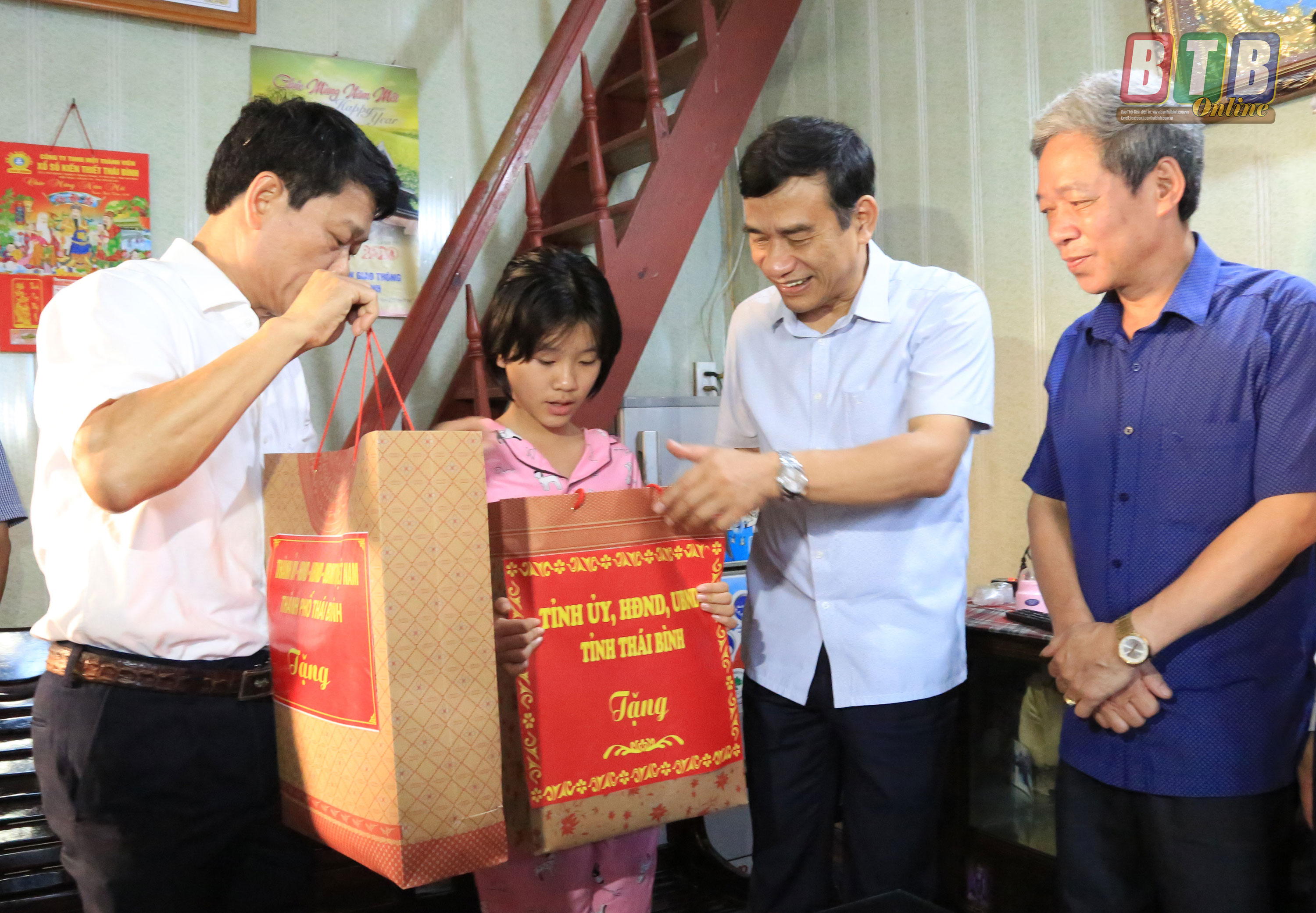 Đồng chí Đặng Trọng Thăng, Phó Bí thư Tỉnh ủy, Chủ tịch UBND tỉnh và lãnh đạo Thành phố thăm, tặng quà hai cháu Kiệt- Lương (thôn Tây Sơn, xã Vũ Chính). Ảnh: Thành Tâm
