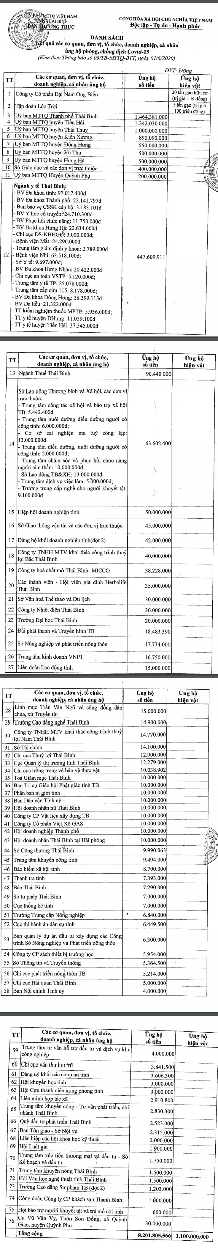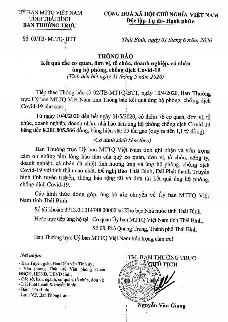 Thông báo kết quả các cơ quan, đơn vị, tổ chức, doanh nghiệp, cá nhân ủng hộ phòng, chống dịch Covid-19