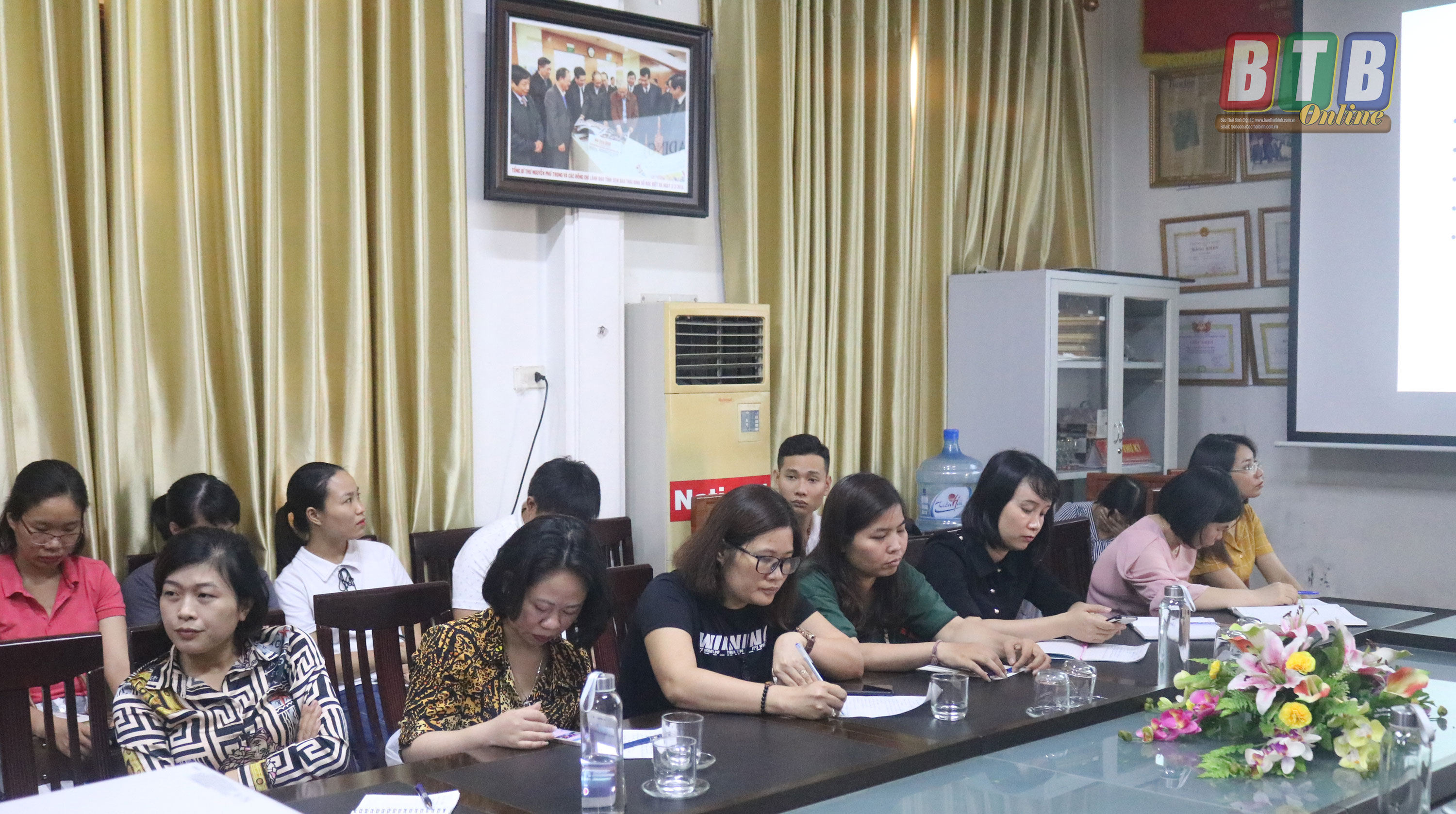 Đồng chí Vũ Anh Thao, Chủ tịch Hội Nhà báo Thái Bình và đồng chí Hoàng Minh Sơn, Tổng Biên tập Báo Thái Bình tặng hoa các giảng viên.