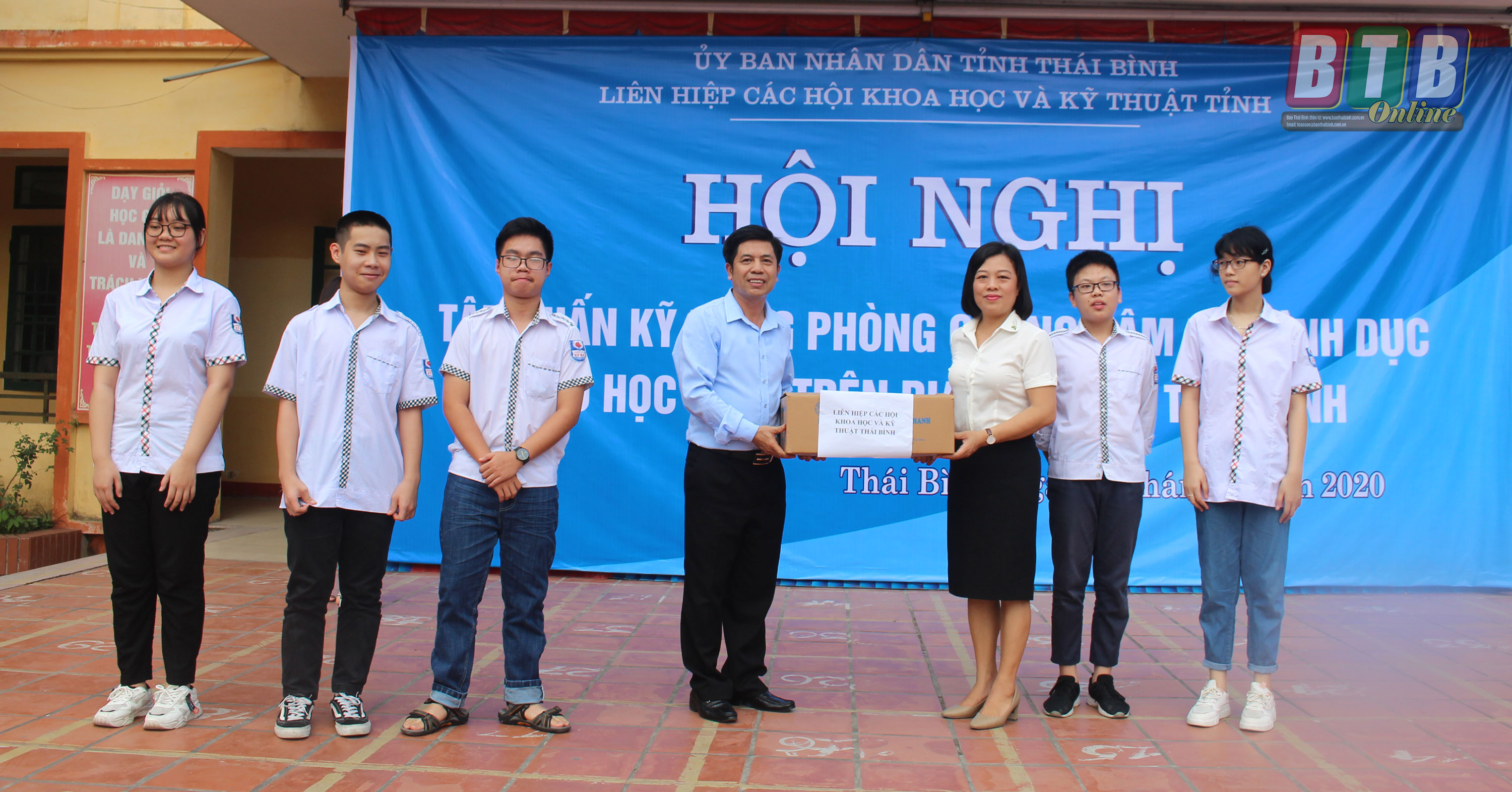 Lãnh đạo Liên hiệp các Hội Khoa học và Kỹ thuật tỉnh tặng quà học sinh Trường THCS Kỳ Bá (thành phố Thái Bình).