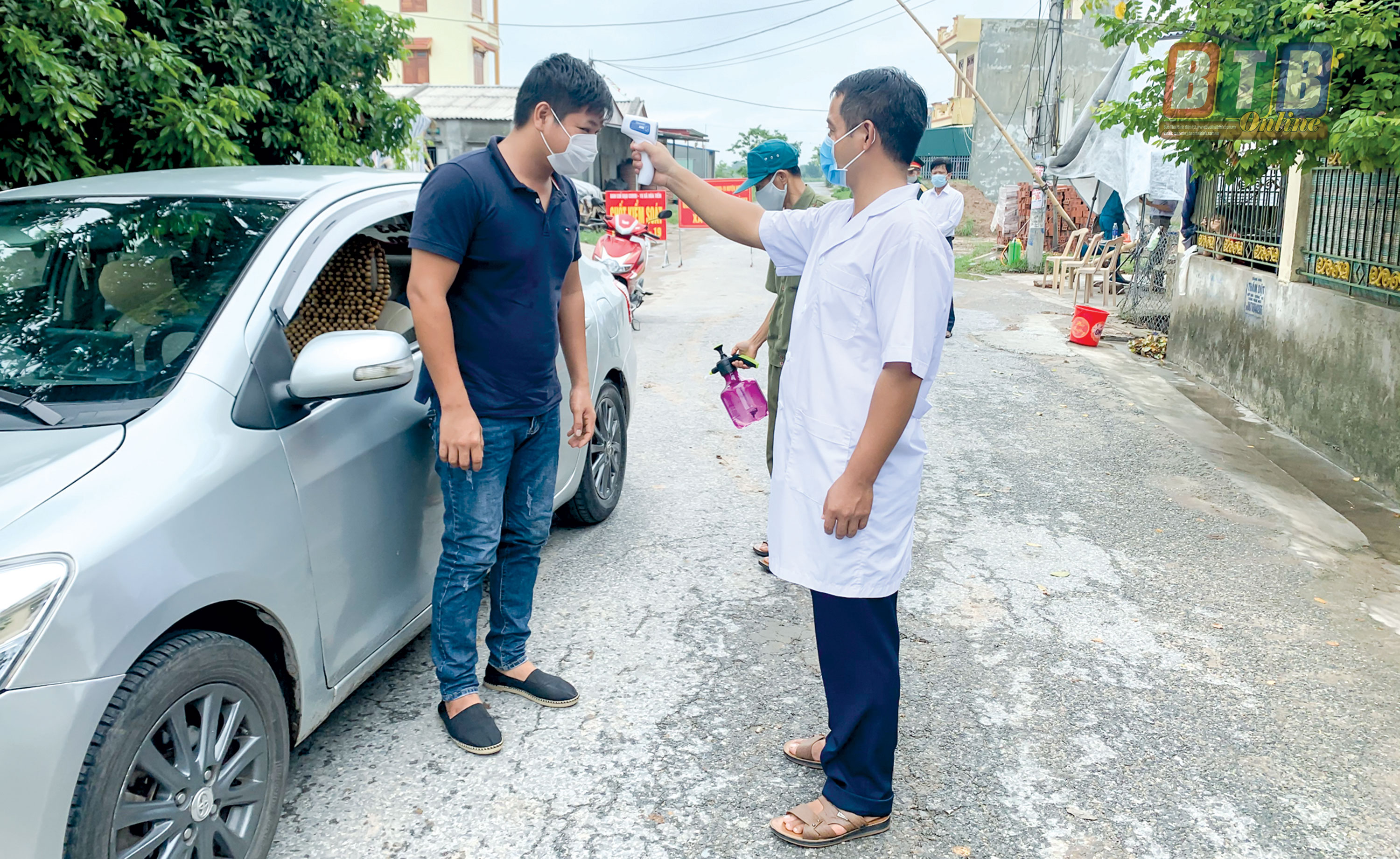Kiểm tra thân nhiệt tại chốt kiểm soát dịch bệnh thôn Bùi, xã Hòa Tiến (Hưng Hà).