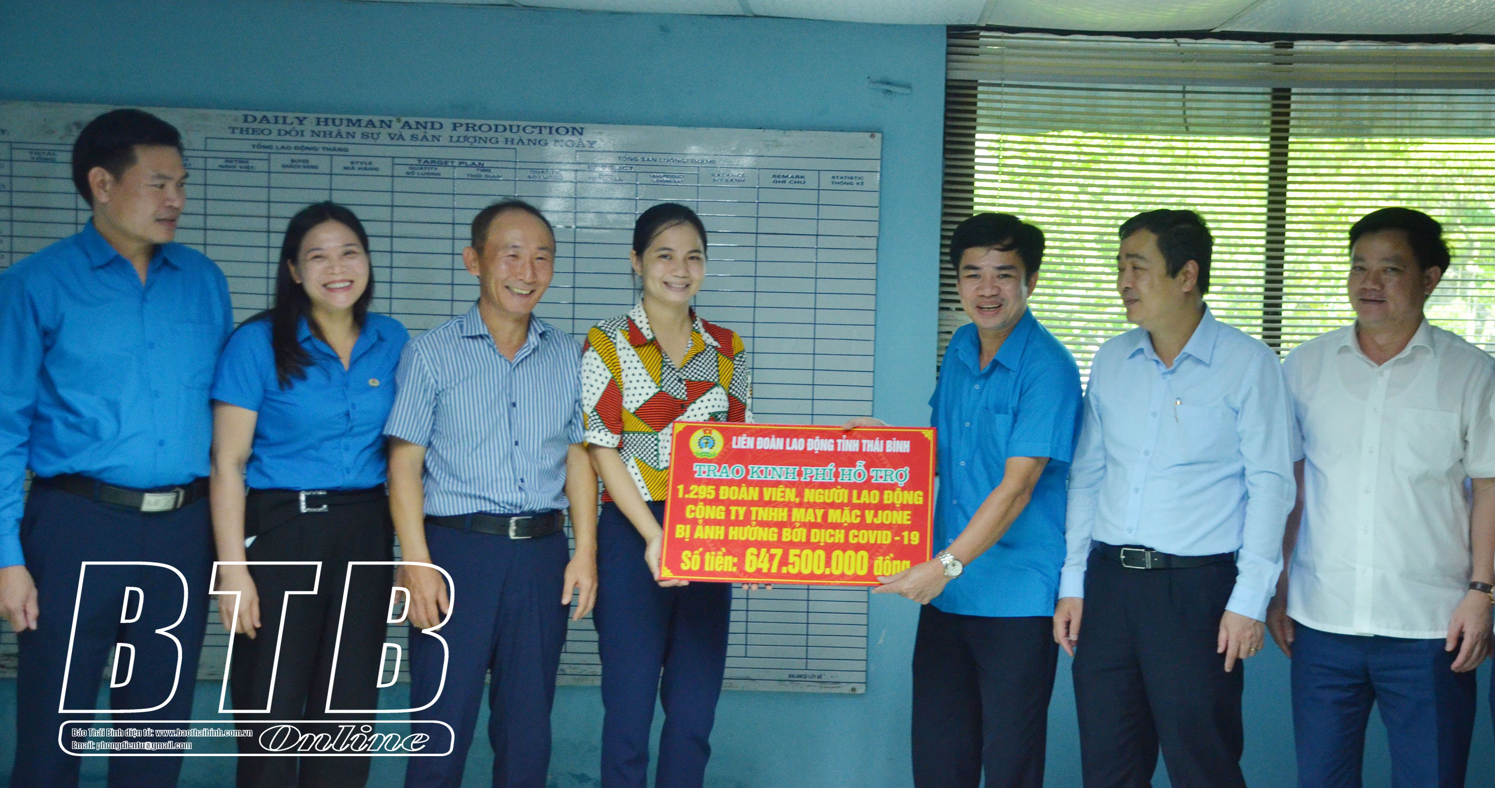 Để động viên người lao động, đồng chí Bí thư Tỉnh ủy và đồng chí Phó Chủ tịch thường trực phụ trách UBND tỉnh, Liên đoàn Lao động tỉnh, huyện Đông Hưng đã trao 1.295 suất quà cho đoàn viên, người lao động Công ty TNHH May mặc V.J.One bị ảnh hưởng bởi dịch Covid-19. Tổng số tiền hỗ trợ trên 647 triệu đồng. Toàn bộ kinh phí trích từ ngân sách của Liên đoàn Lao động tỉnh nhằm chia sẻ khó khăn doanh nghiệp và người lao động.