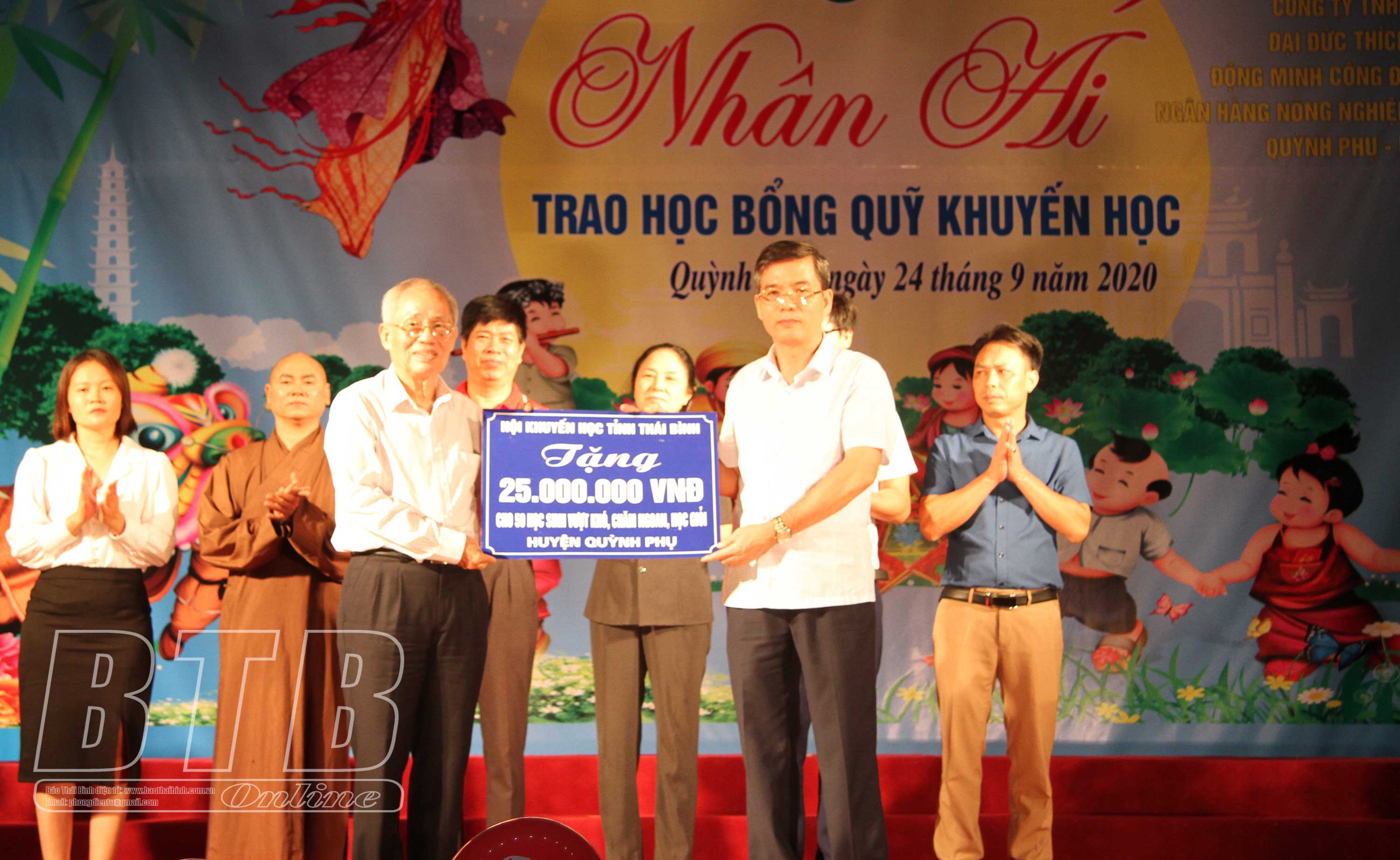 Tại chương trình, 271 học sinh có hoàn cảnh khó khăn trên địa bàn huyện được nhận quà Trung thu và học bổng. Tổng số kinh phí trao tặng trị giá 136 triệu đồng, trong đó các tập thể, cá nhân tài trợ 76 triệu đồng. Số kinh phí còn lại được trích từ quỹ nhân đạo và quỹ khuyến học của huyện Quỳnh Phụ.