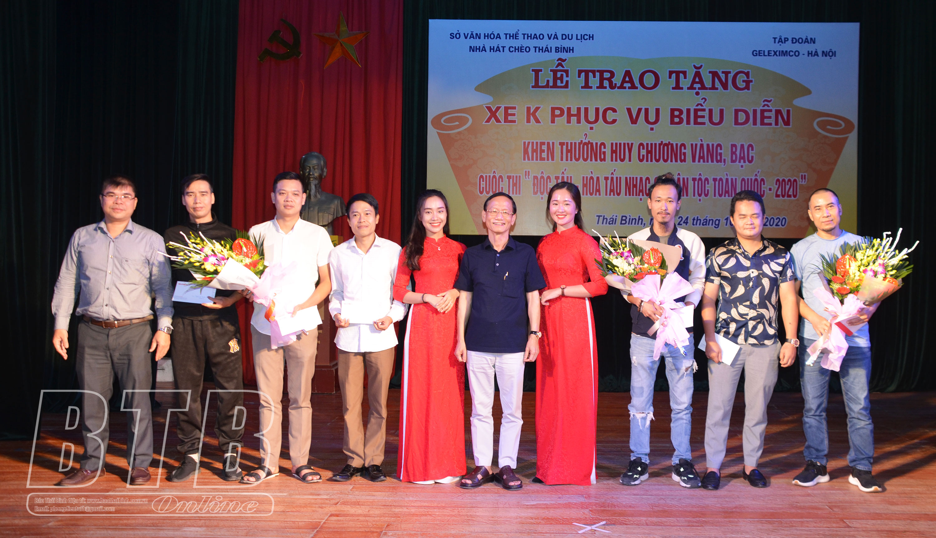 Tại buổi trao tặng, đại diện Tập đoàn Geleximco đã trao tặng cho Nhà hát Chèo Thái Bình chiếc xe 35 chỗ ngồi nhãn hiệu SAMCO trị giá gần 2 tỷ đồng để cán bộ, diễn viên, nhạc công Nhà hát Chèo Thái Bình thuận tiện cho việc lưu diễn. Nhân dịp này, Tập đoàn Geleximco cũng đã tặng quà động viên tập thể và nghệ sĩ đạt giải tại cuộc thi “Độc tấu - Hòa tấu nhạc cụ dân tộc toàn quốc năm 2020” với tổng số tiền 50 triệu đồng.