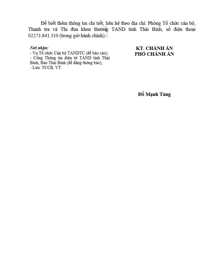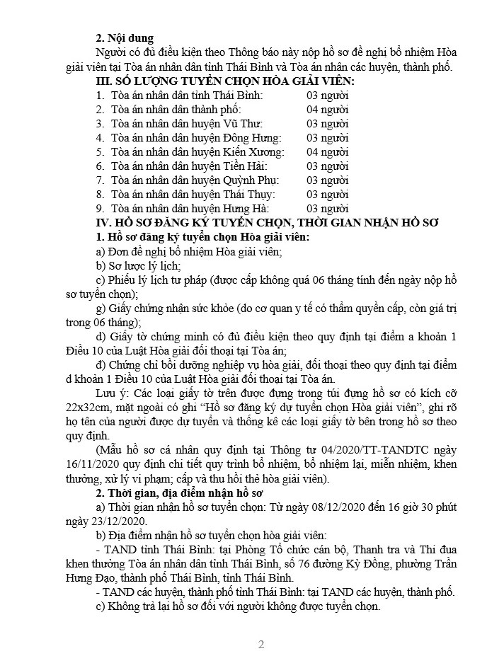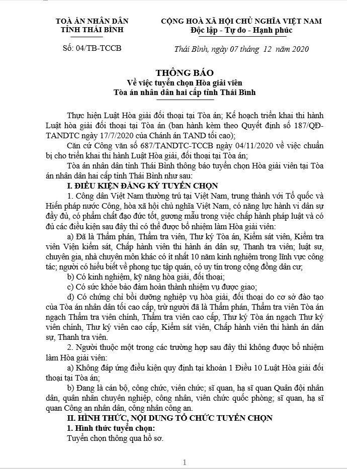 Thông báo về việc tuyển chọn Hòa giải viên Tòa án nhân dân hai cấp tỉnh Thái Bình