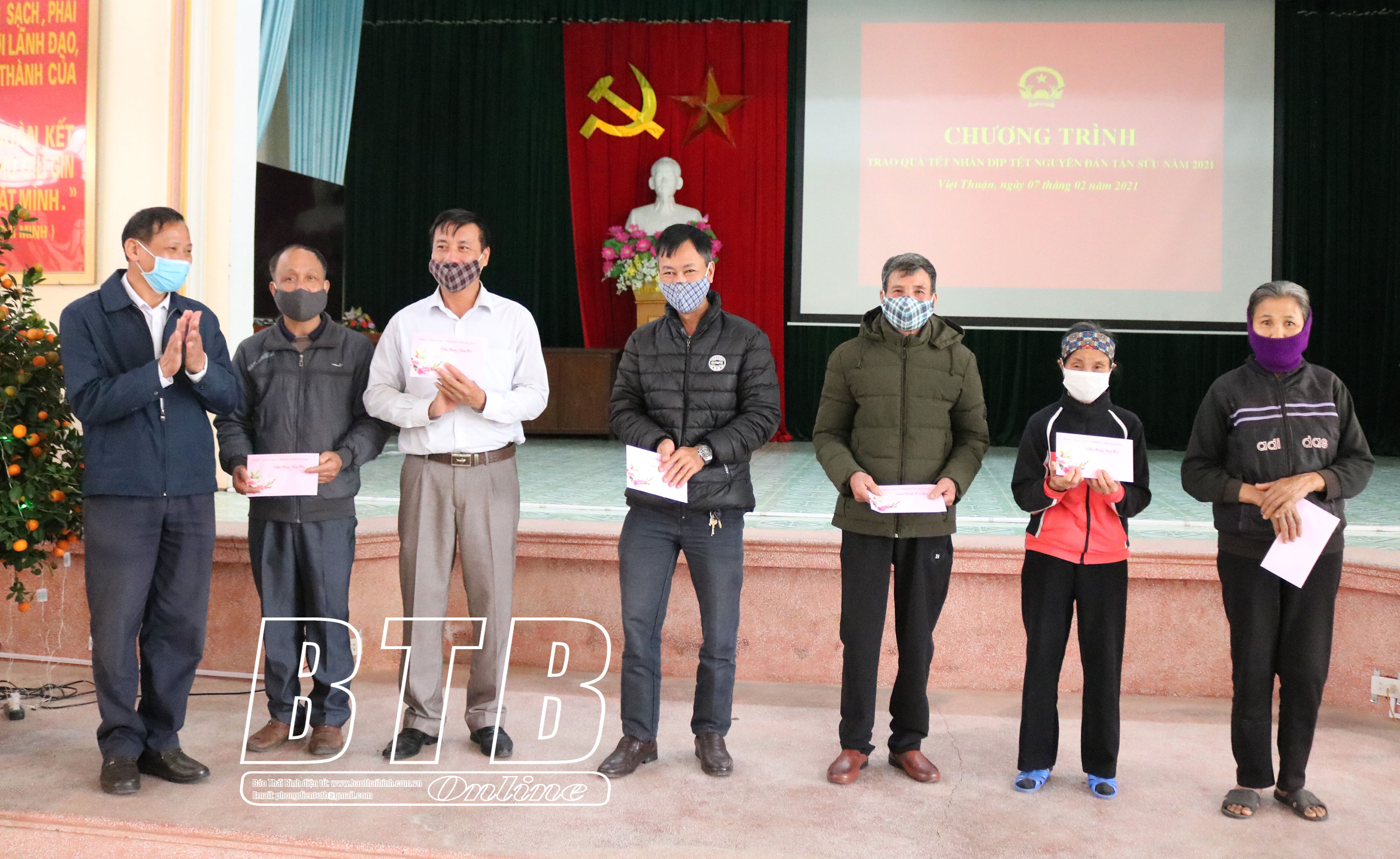 Đồng chí Hoàng Minh Sơn, Tỉnh ủy viên, Tổng Biên tập Báo Thái Bình, Chủ tịch Hội Nhà báo Thái Bình trao quà tết cho hộ nghèo, hộ cận nghèo, người có hoàn cảnh khó khăn tại xã Việt Thuận.
