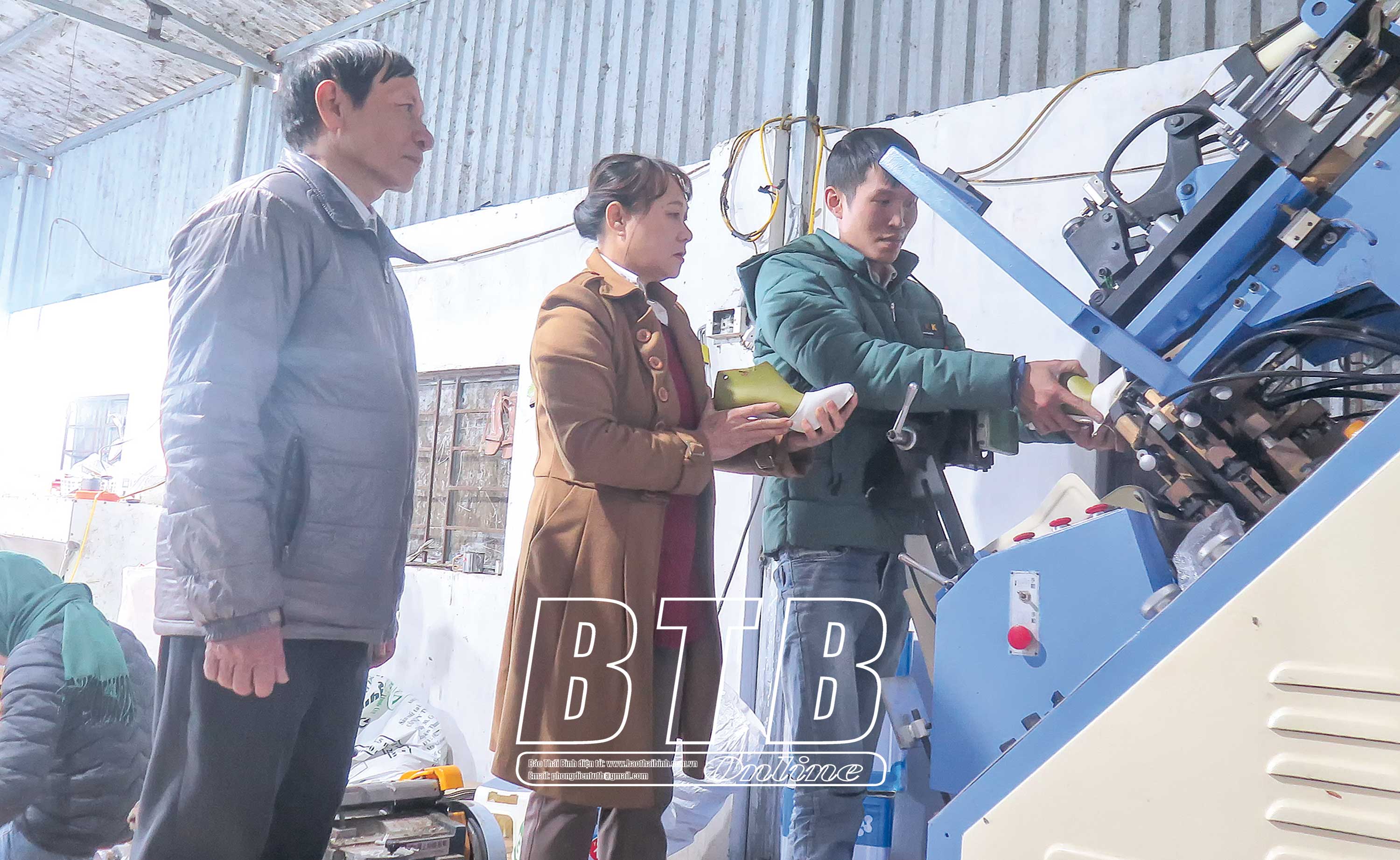 Bà Trần Thị Phượng, thôn Cự Lâm, xã Xuân Hòa (Vũ Thư) gắn bó với nghề sản xuất giày dép từ năm 2017.