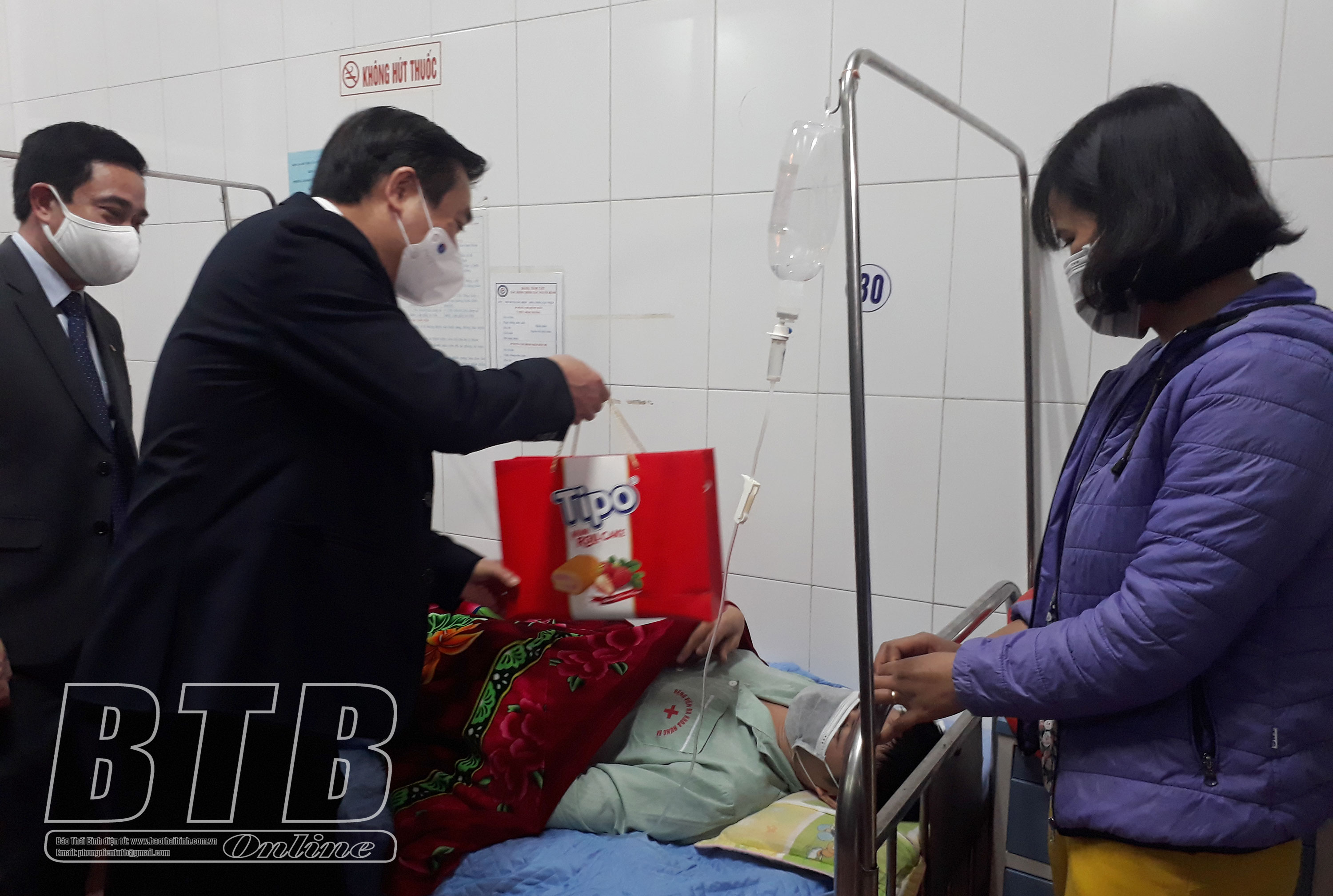 Đồng chí Nguyễn Văn Giang, Ủy viên Ban Thường vụ, Trưởng ban Dân vận, Chủ tịch Ủy ban MTTQ Việt Nam tỉnh tặng quà bệnh nhân đang điều trị tại Bệnh viện Đa khoa Hưng Hà.