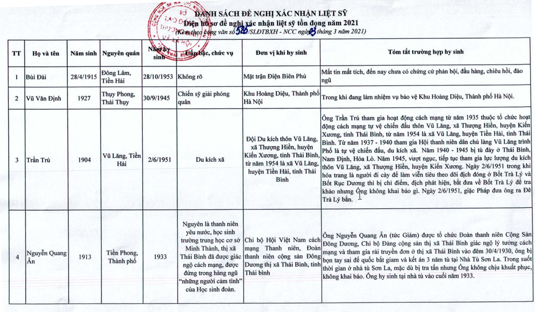 Danh sách đề nghị xác nhận liệt sĩ diện hồ sơ đề nghị xác nhận liệt sĩ tồn đọng năm 2021