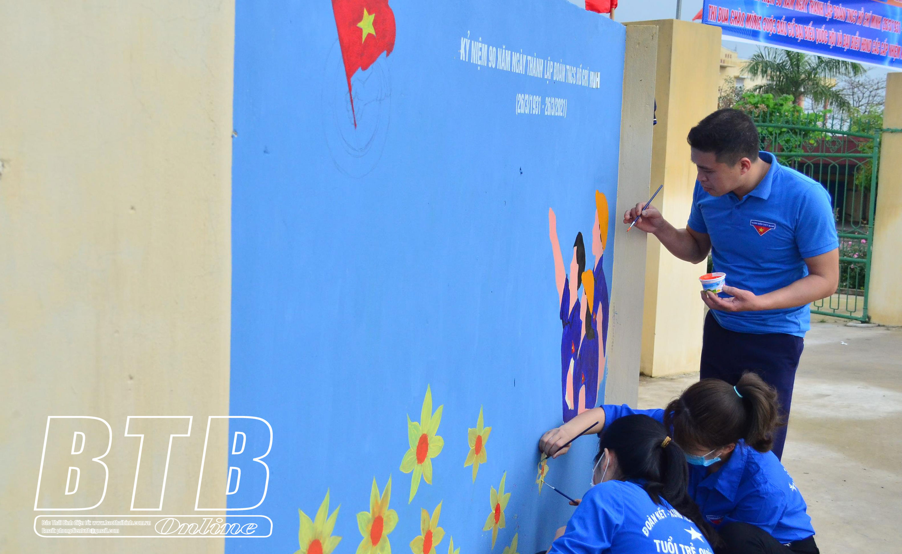 Đoàn viên, thanh niên vẽ tranh tường cổ động tại xã Quỳnh Minh (huyện Quỳnh Phụ).