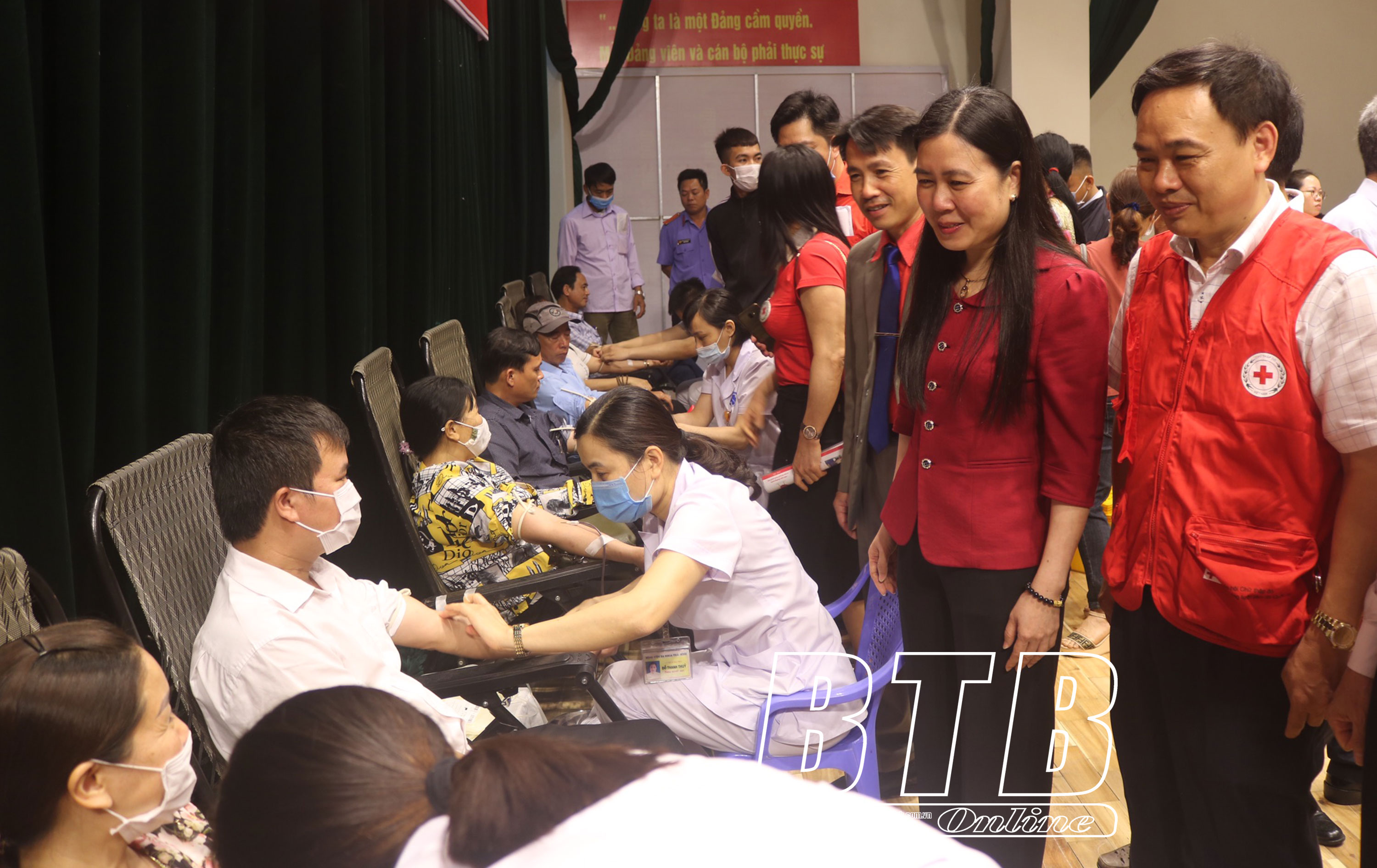 Đồng chí Trần Thị Bích Hằng, Tỉnh uỷ viên, Phó Chủ tịch UBND tỉnh, Trưởng ban Chỉ đạo vận động HMTN tỉnh động viên người tham gia hiến máu.